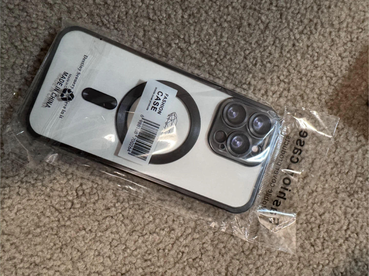 This is a new fashion case designed for the iPhone 15 Pro Max. It's a clear case with a magnetic ring on the back, perfect for MagSafe accessories. Made in China.