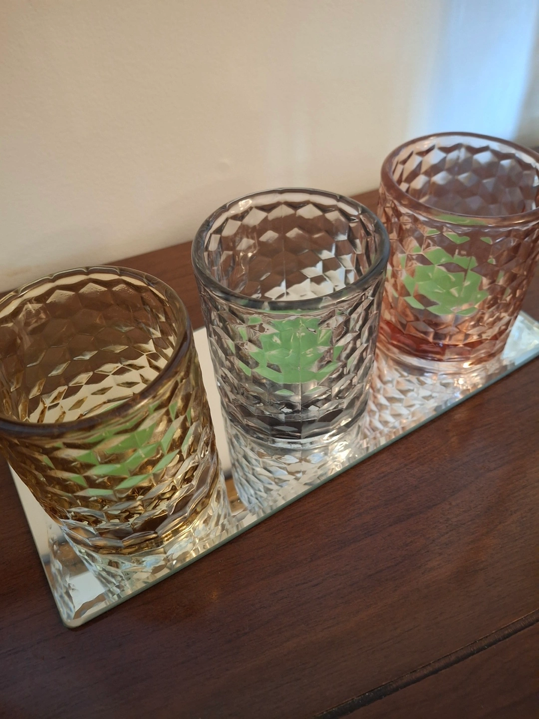Set of 3 colourful glass candle holders on mirrored bevelled plate. 3 new tea candles included. Holders are approx 3” tall, mirrored tray is 9.5” x 4”. New, without box.