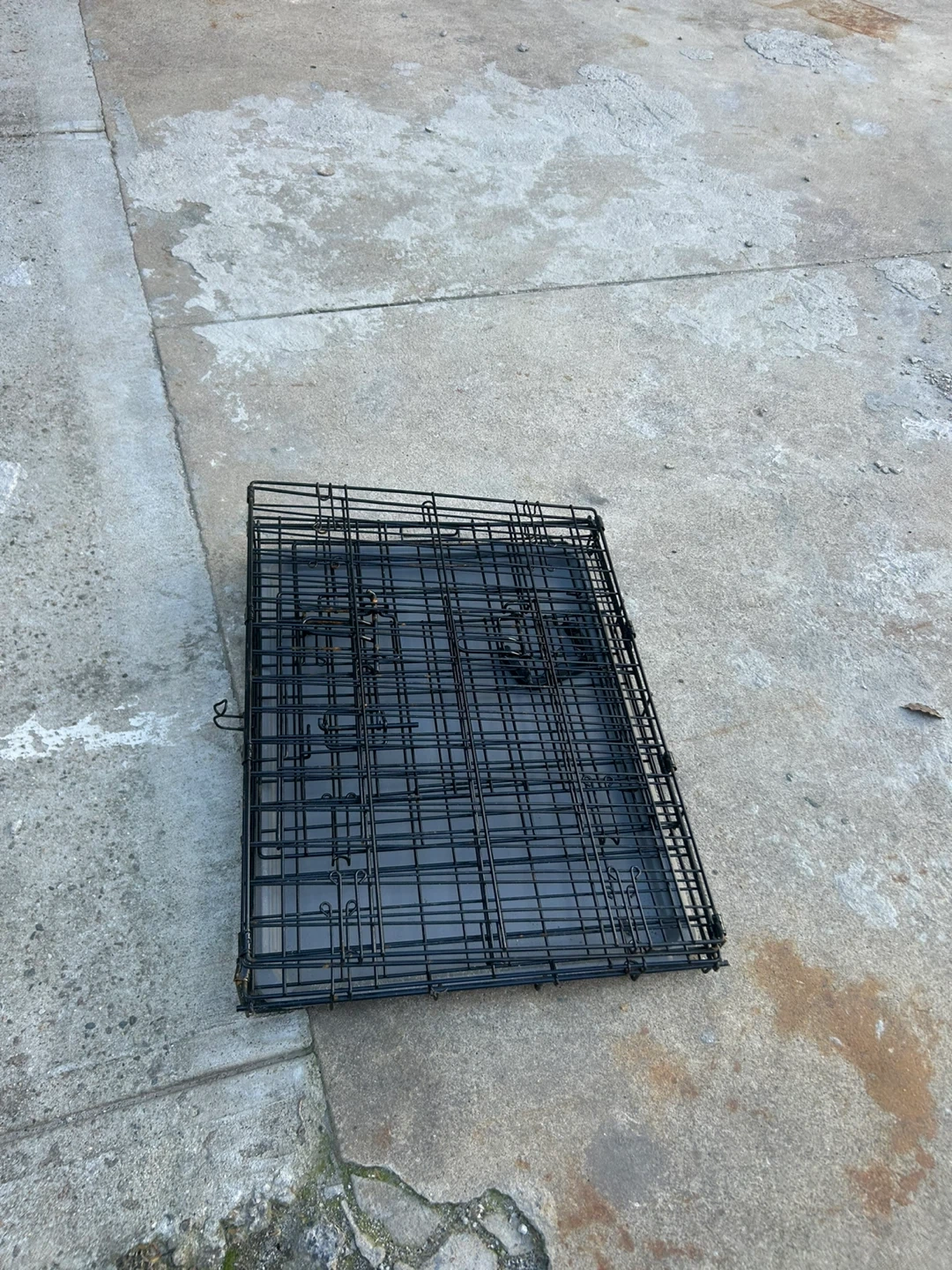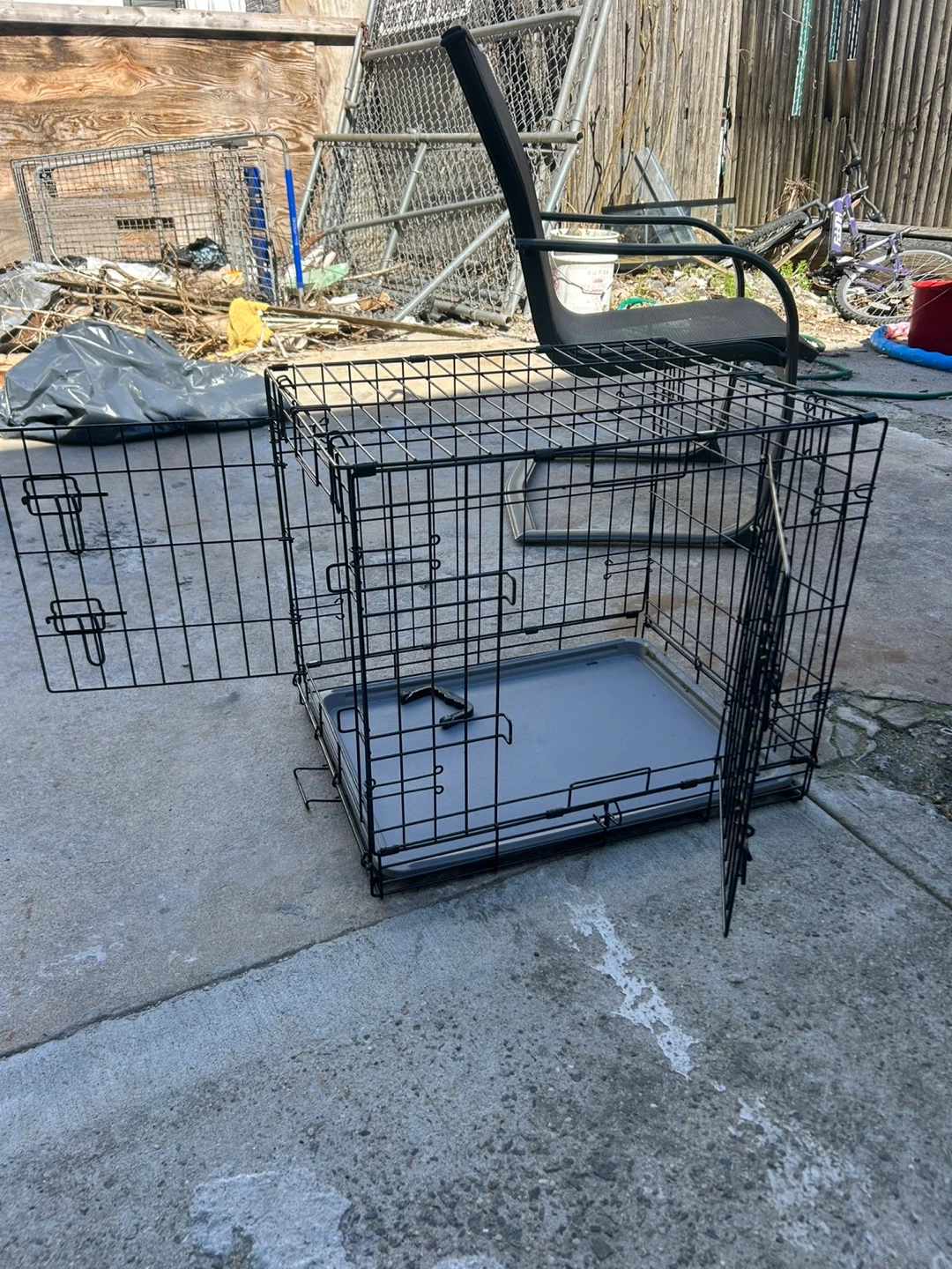 This is a black wire dog crate with a removable plastic tray. It features two doors for easy access and a sturdy wire construction. It's a practical enclosure for pets.