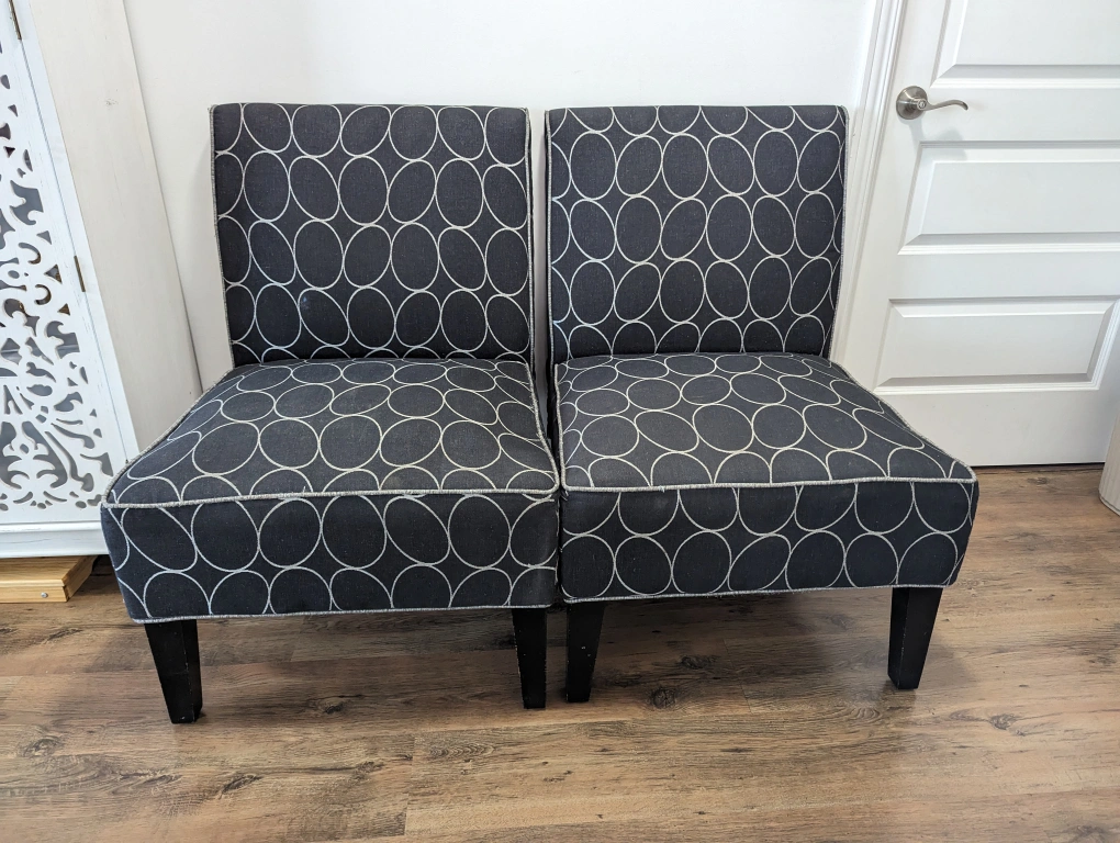 Two stylish accent chairs. Black fabric with a white oval pattern. Simple, modern design. Dark wood legs. Good for living room.