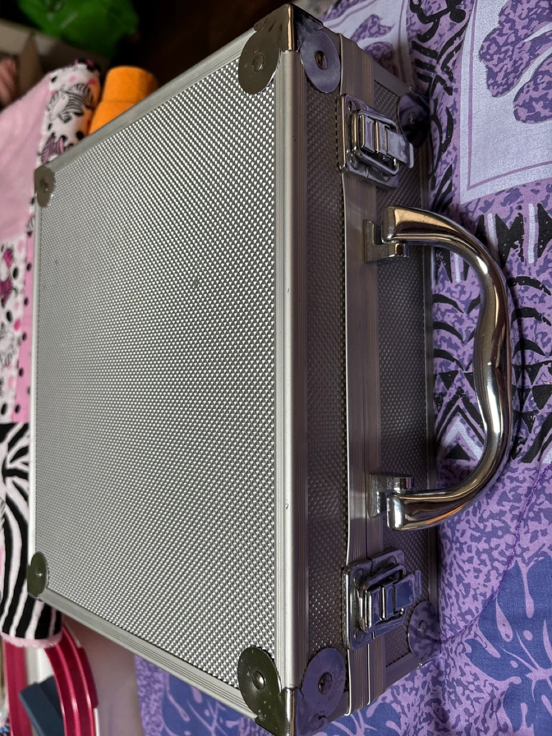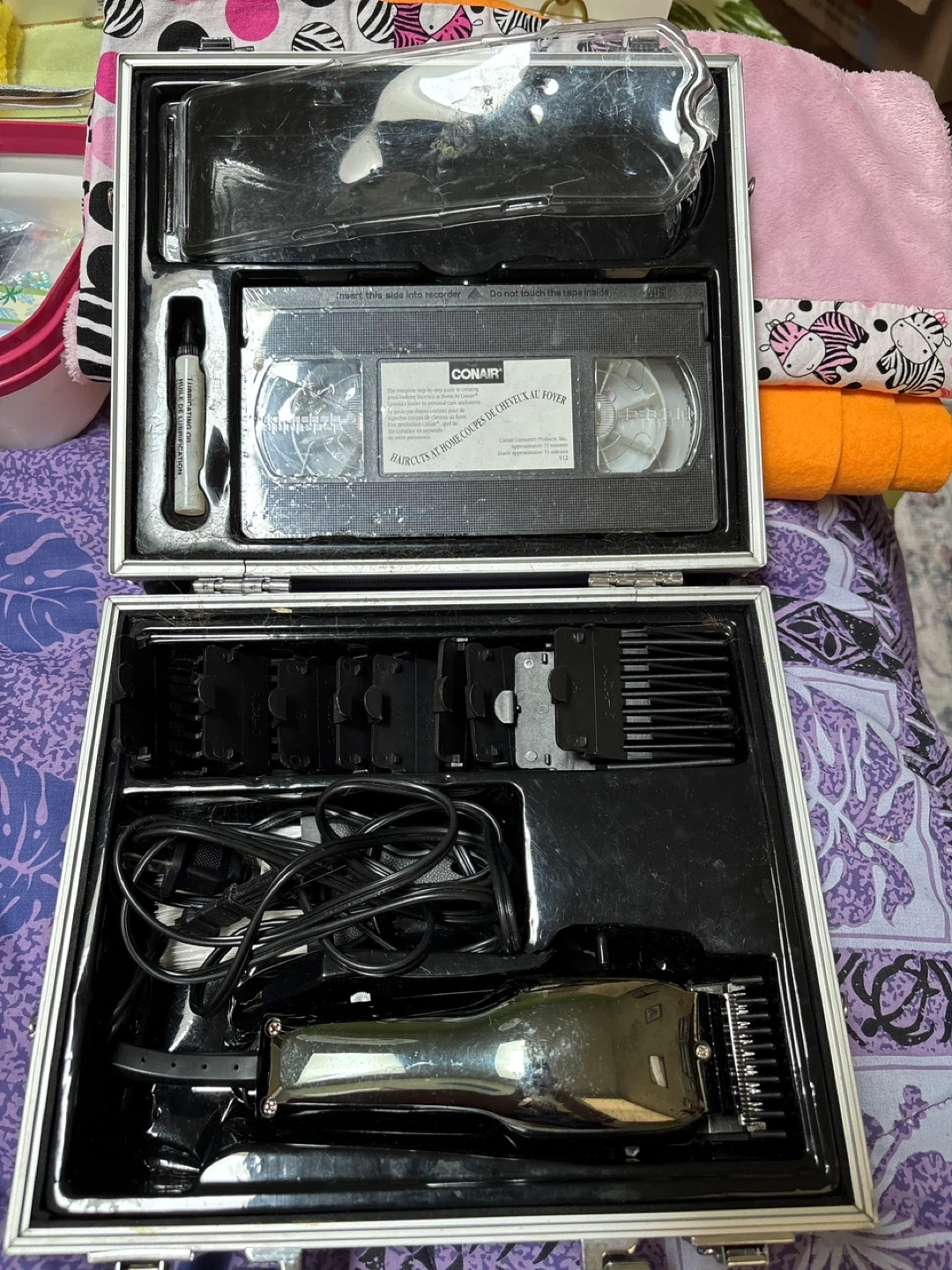 This Conair hair clipper kit comes in a silver metal case. It includes the clipper, multiple comb attachments and a cleaning brush. A VHS instructional tape is also included.