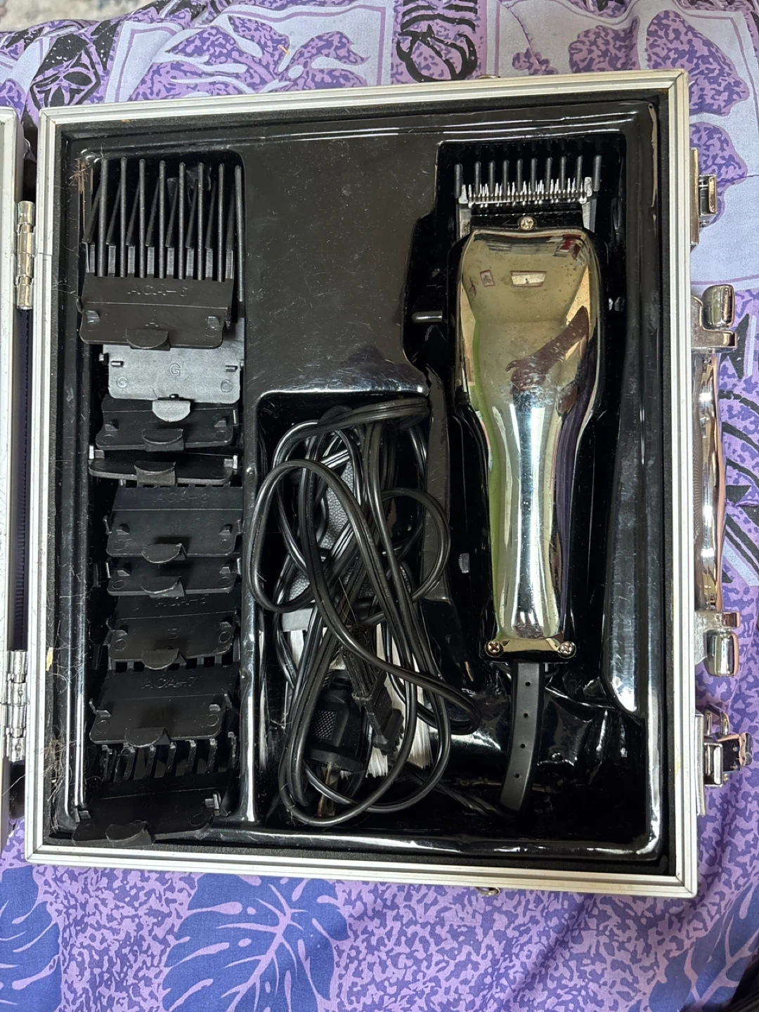 This Conair hair clipper kit comes in a silver metal case. It includes the clipper, multiple comb attachments and a cleaning brush. A VHS instructional tape is also included.