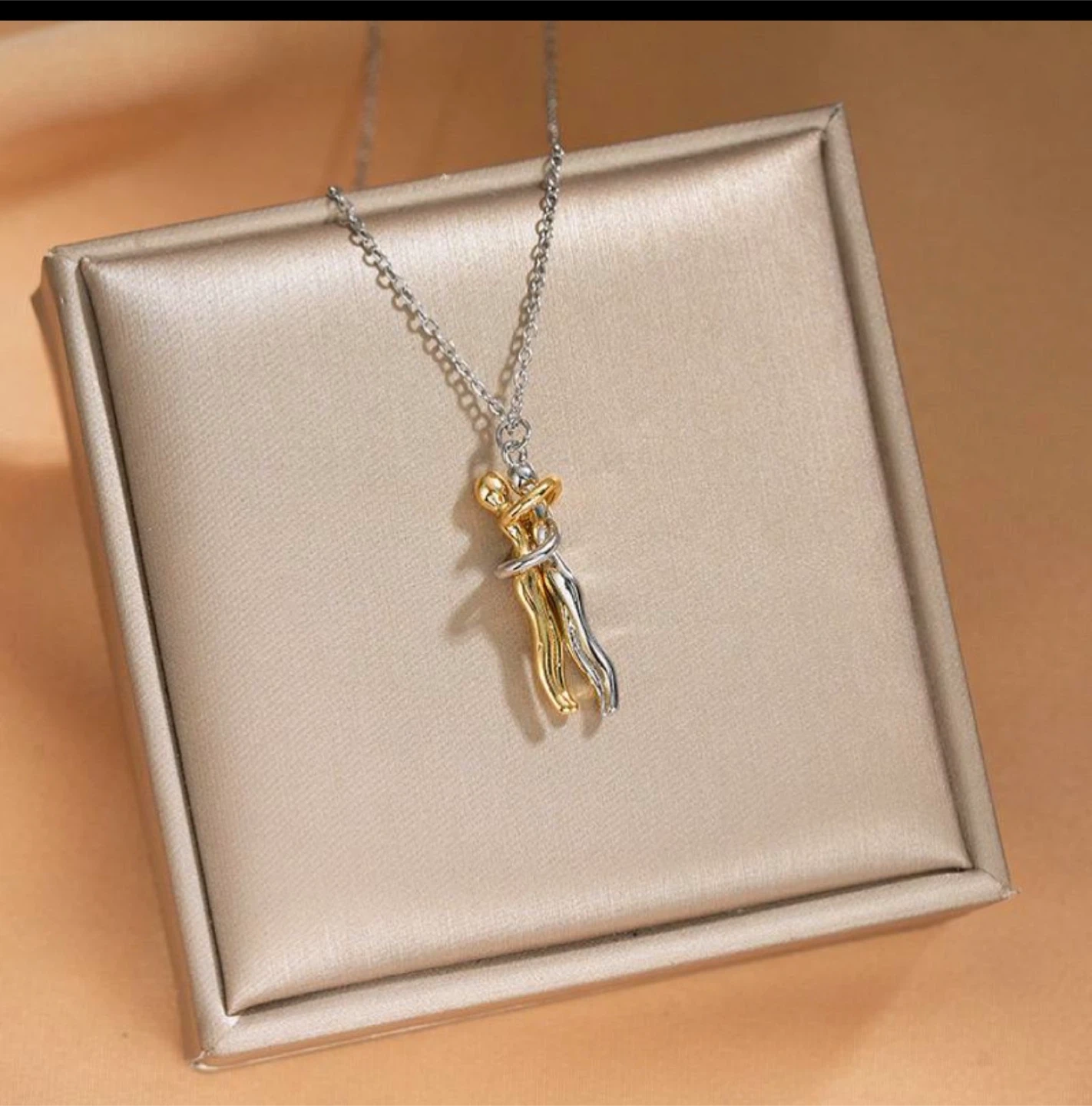 This is a beautiful hug pendant necklace, featuring a unique design with silver and gold plated tones. It's a lovely piece to add to your collection or give as a thoughtful gift