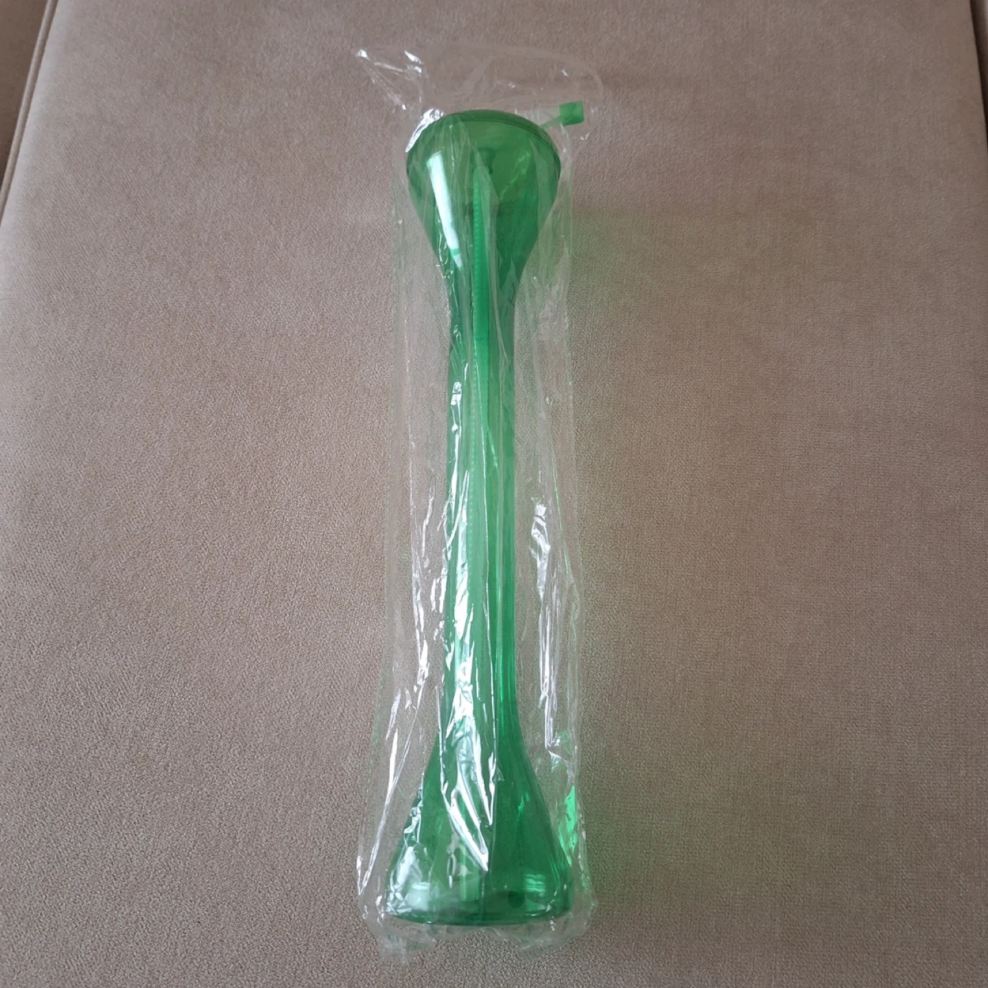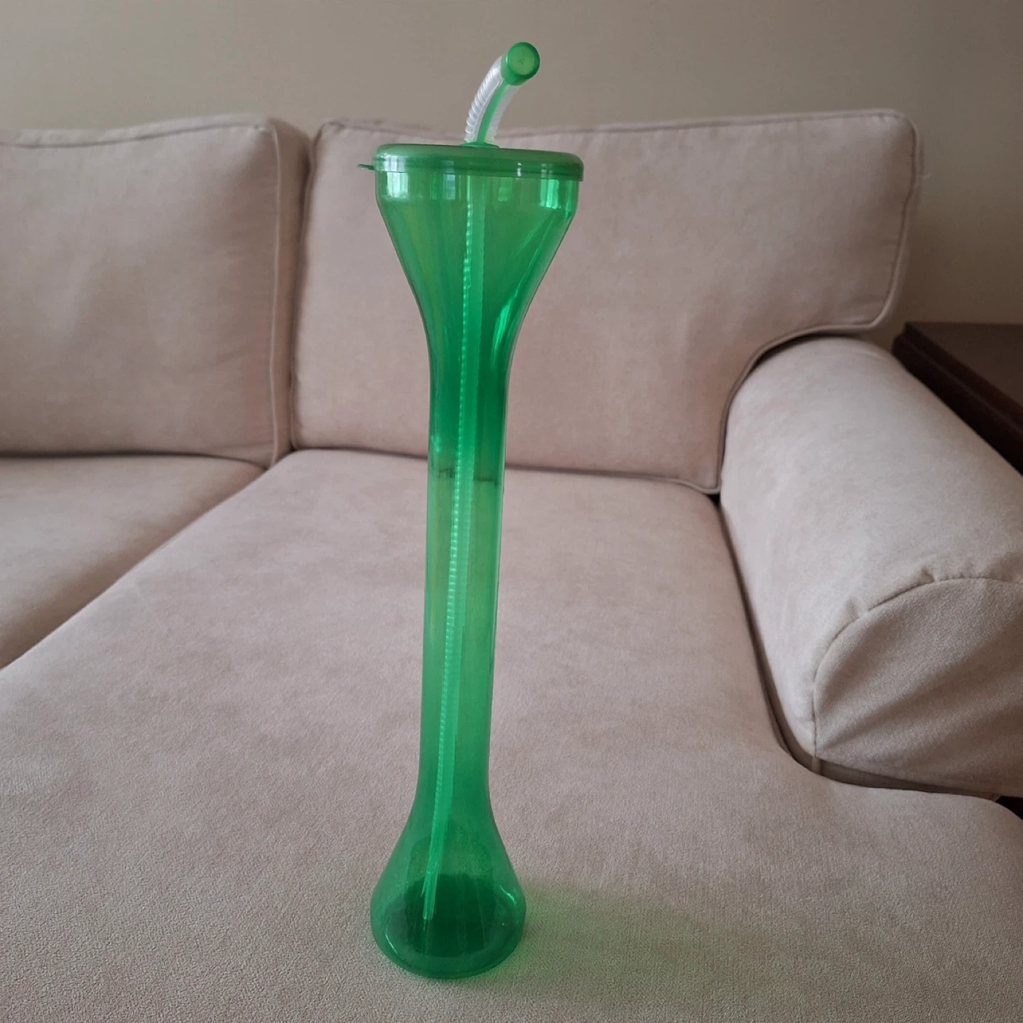 A fun green novelty tumbler cup. It comes with a lid and a bendable straw for easy sipping. This plastic cup is great for parties or everyday use!