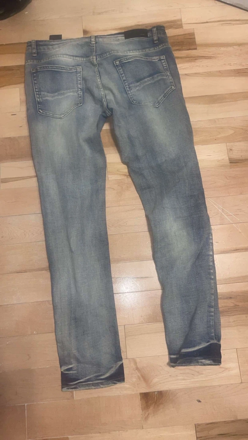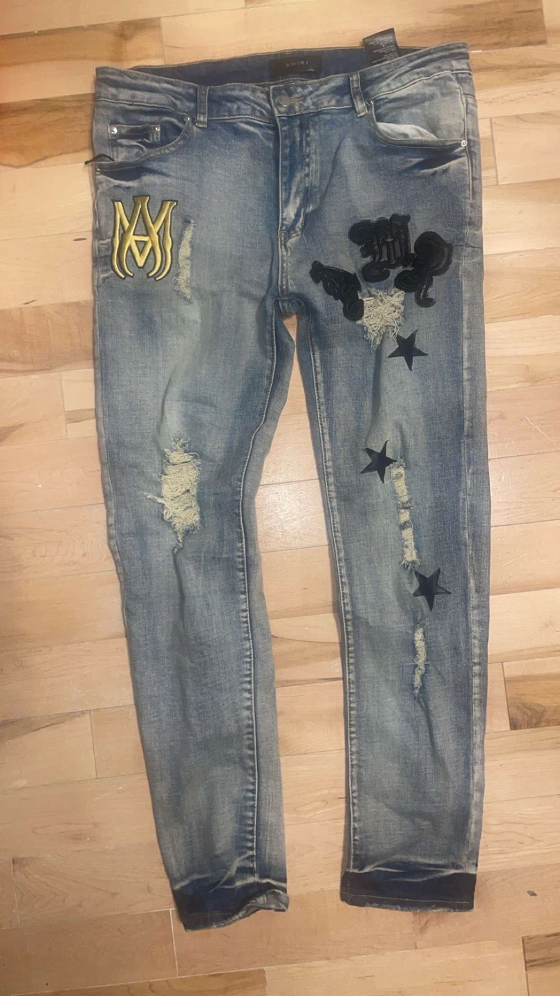 These are a pair of AMIRI denim jeans with a distressed look. They feature patches and star designs. A stylish addition to your wardrobe!(price negotiable)