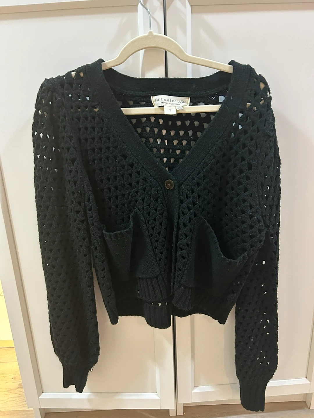Saltwater Luxe black crochet knit cardigan. It's a size small with two front pockets. This stylish cardigan is perfect for layering over a cami or tee.