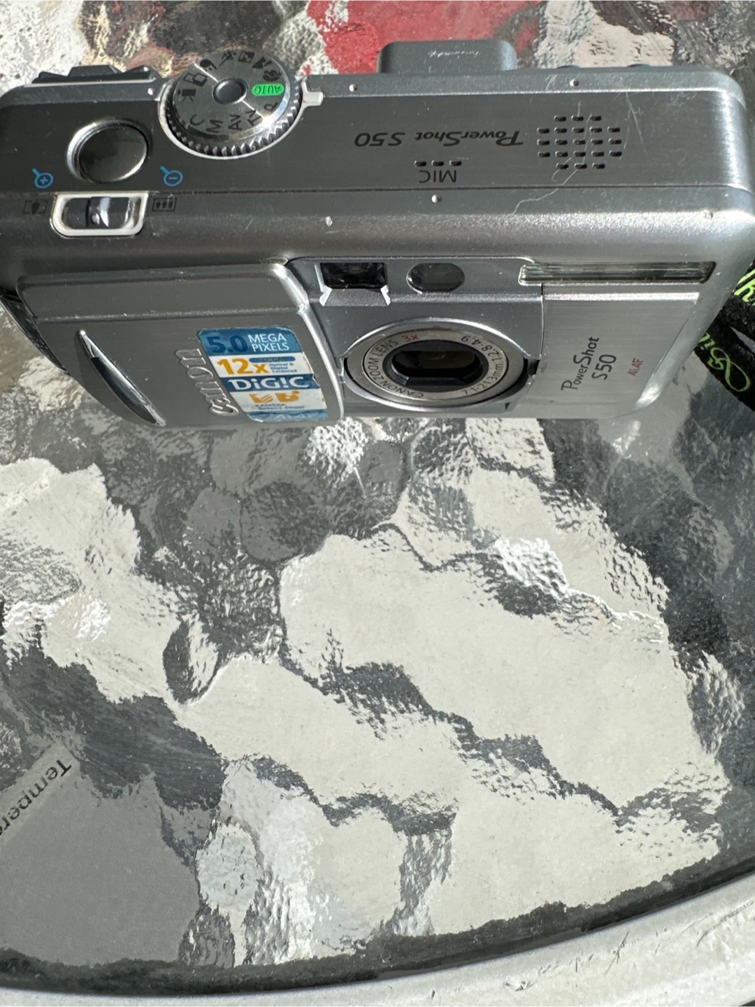 This Canon PowerShot S50 is a digital camera. It features 5.0 mega pixels and 12x optical zoom with DiG!C technology. It's silver in colour.