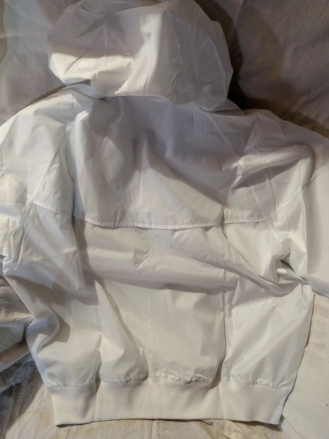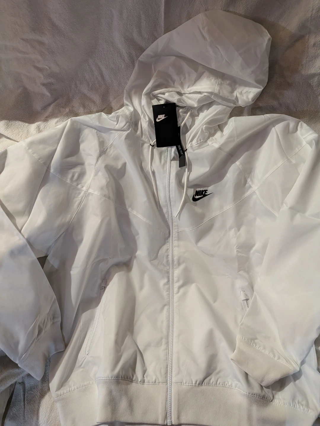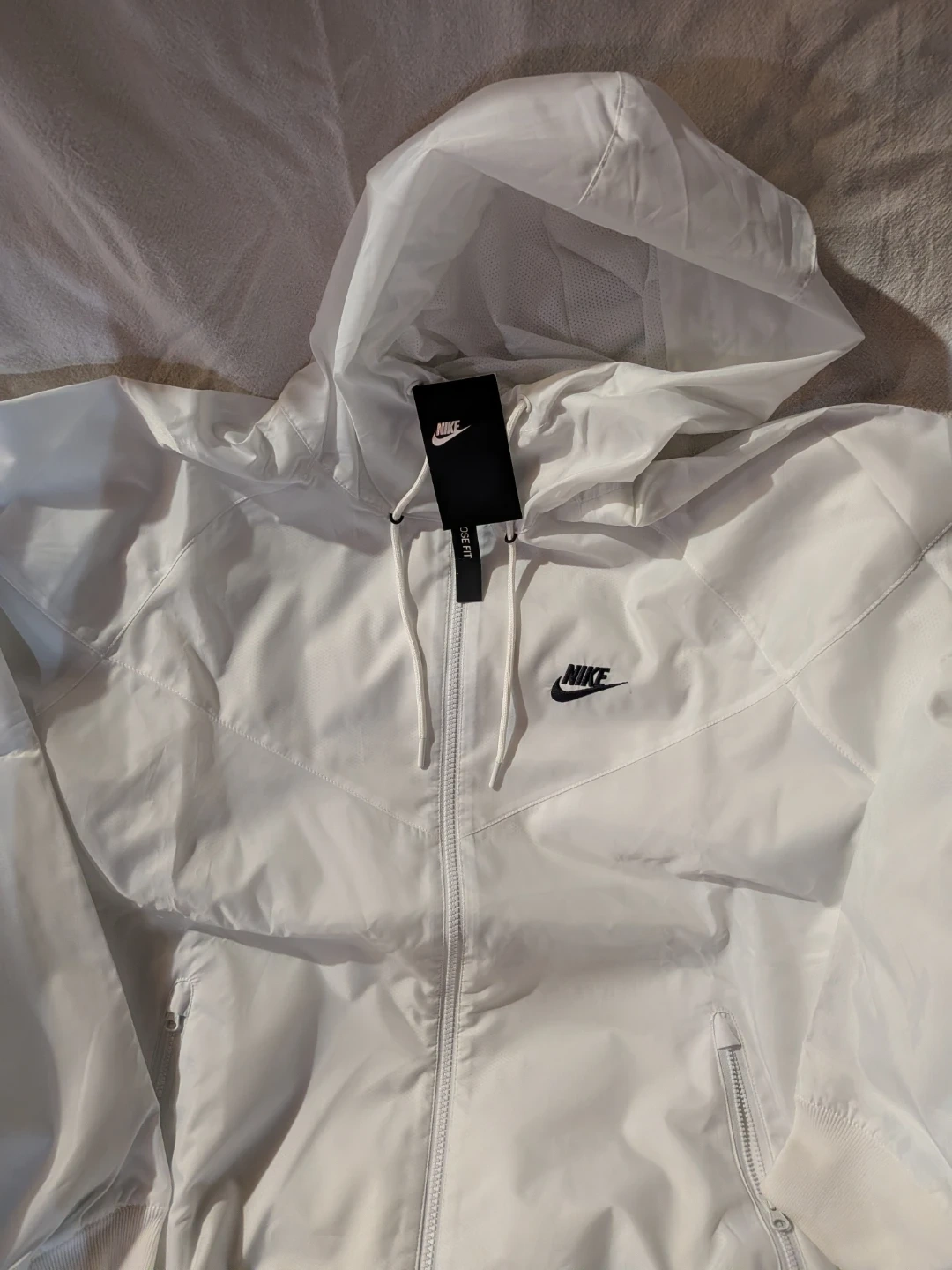 This is a white Nike windrunner jacket. It's made of lightweight material and features a full-zip closure with a hood. The elastic cuffs and hem help keep the elements out. Exclusive color.