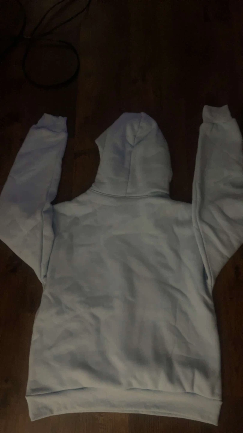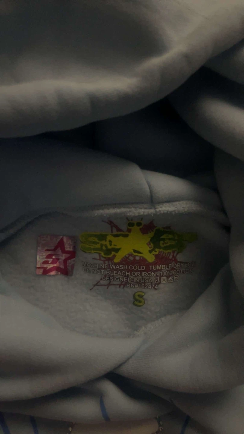 This is a light blue Sp5der hoodie. It's made from 100% cotton. The size is small. Includes original packaging.
