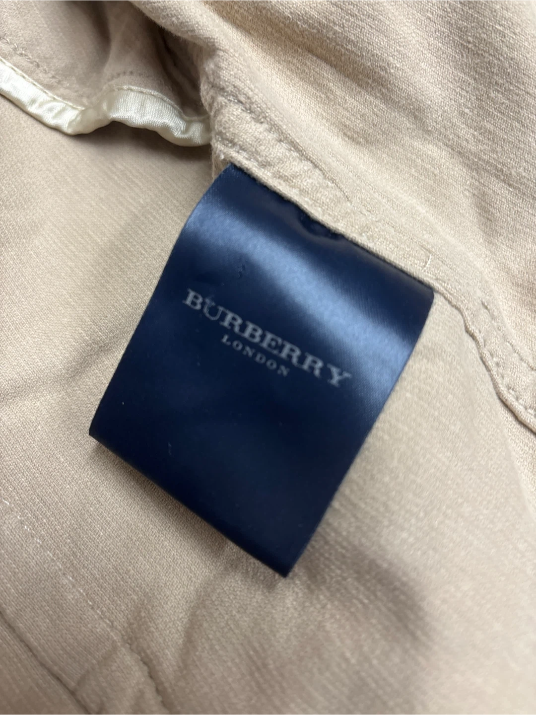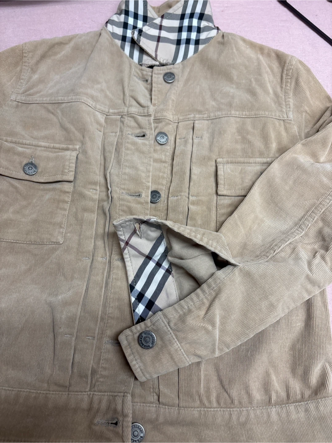 This is a classic Burberry London corduroy jacket in a versatile beige color. It features the iconic Burberry check lining and is made in Italy. Size is USA 2, UK 4.