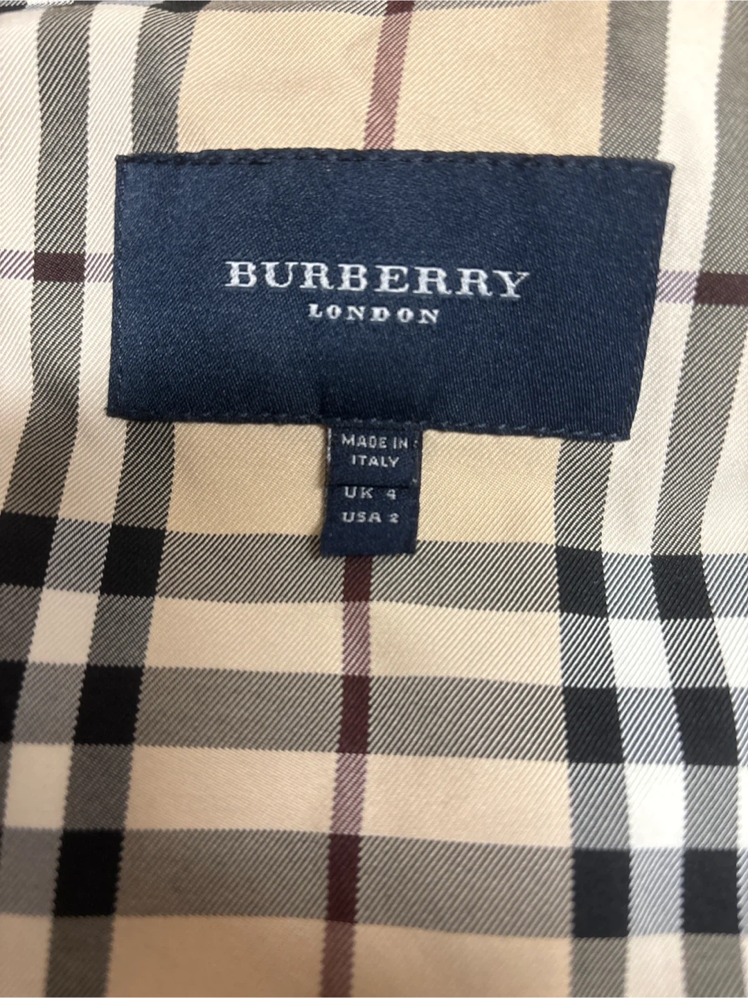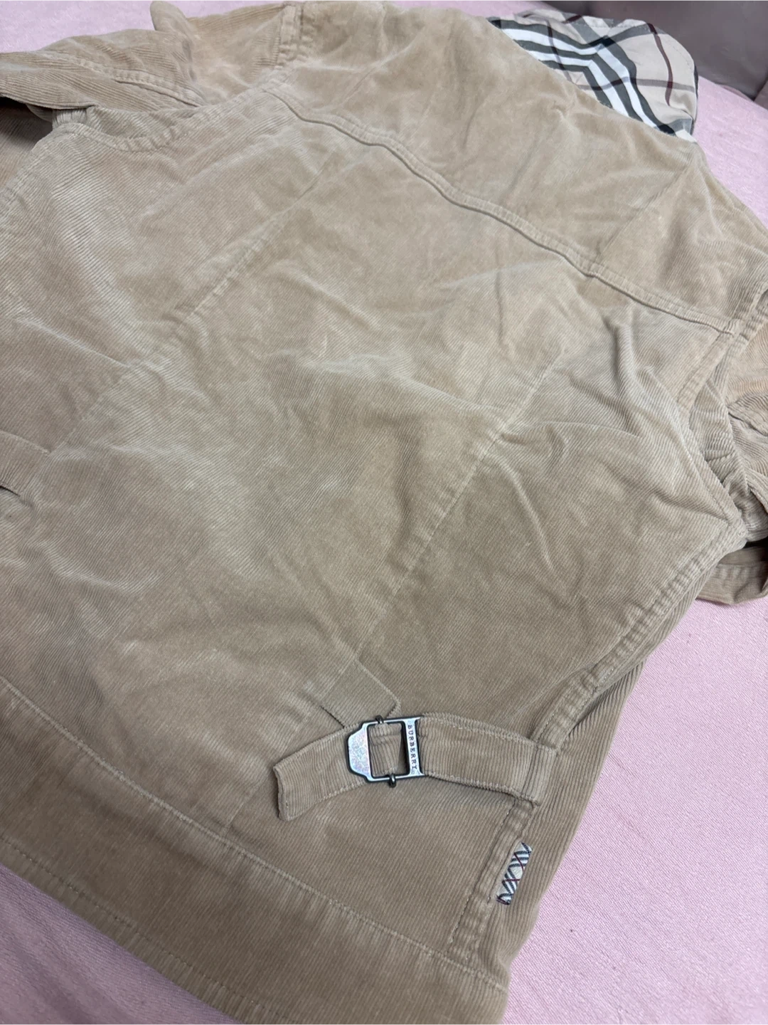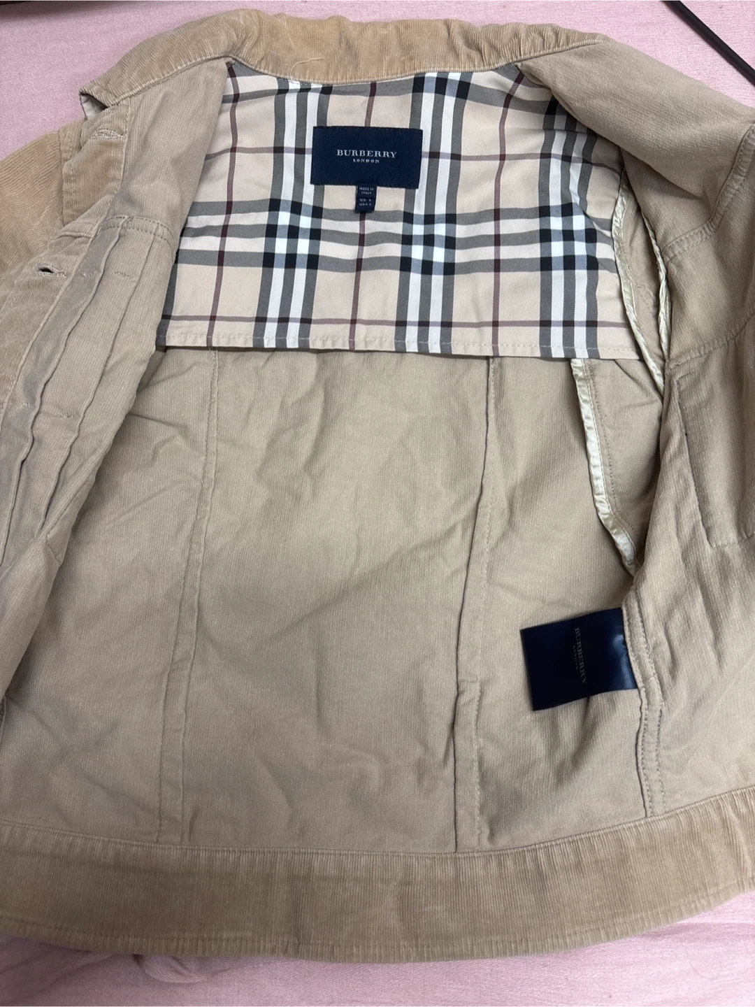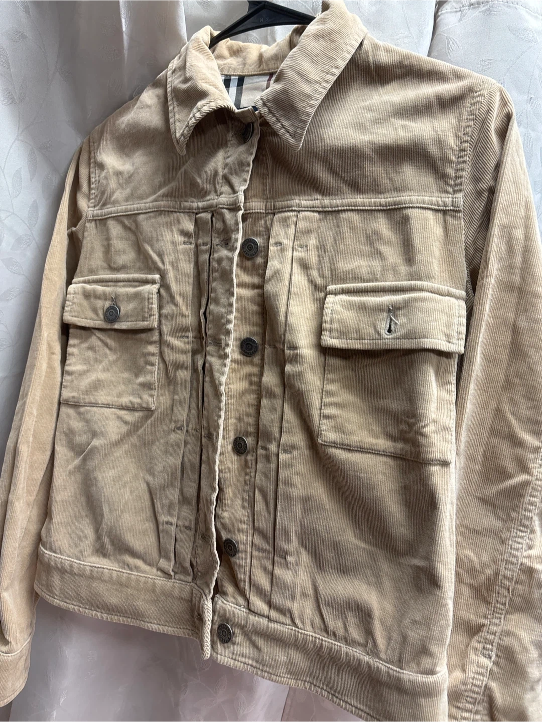 This is a classic Burberry London corduroy jacket in a versatile beige color. It features the iconic Burberry check lining and is made in Italy. Size is USA 2, UK 4.