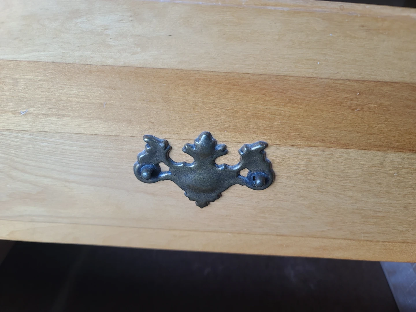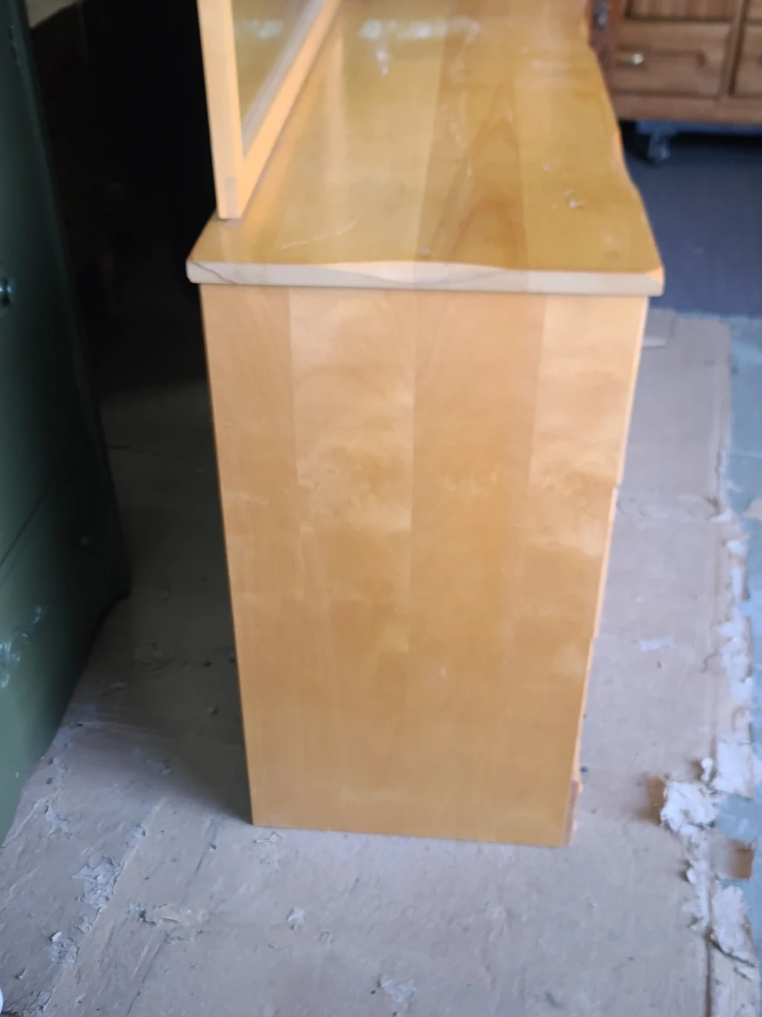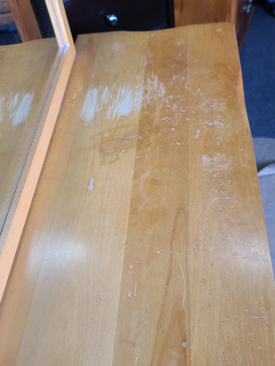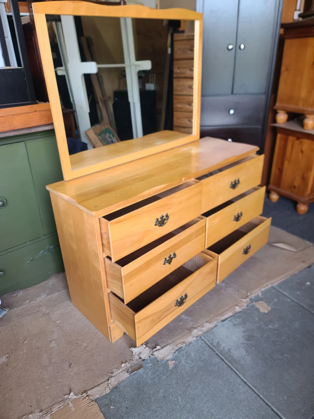Classic light wood dresser with mirror. Has six drawers with antique-style pulls. Mirror is detachable. This is a dresser with a mirror attached. Some surface wear is visible on the top. Measurements: W 48 1/2" X D 16" X H 30". Delivery can be arranged. Viewing and pickup by appointment.