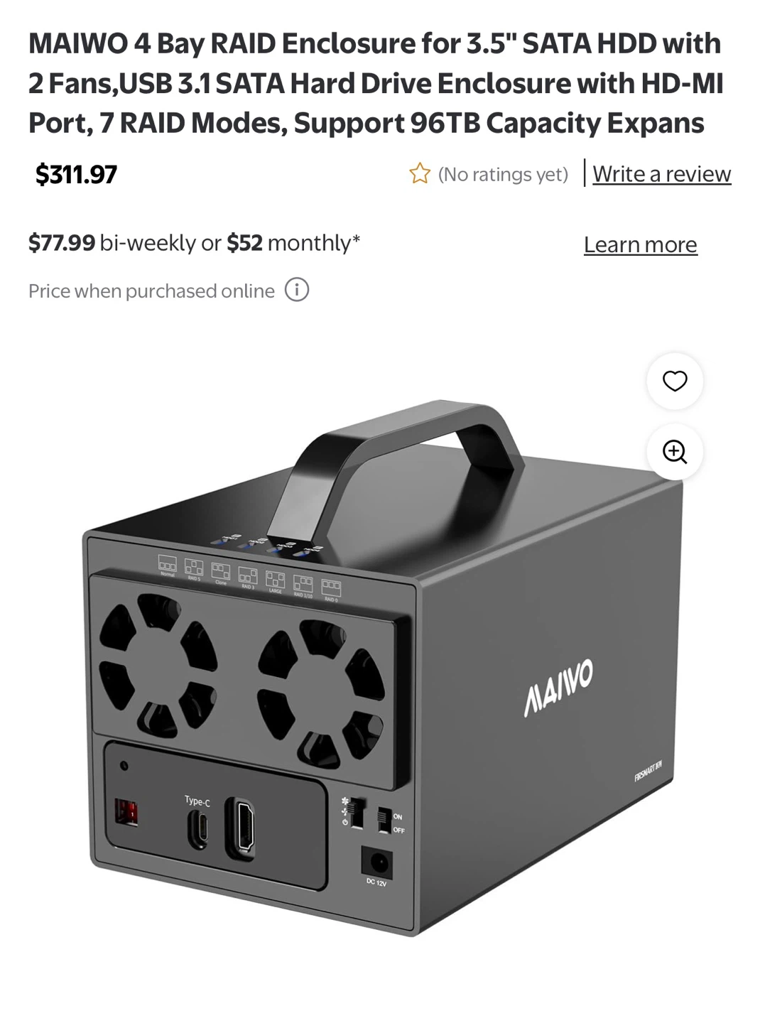 MAIWO 4 bay RAID enclosure for 3.5" SATA HDDs. Supports up to 96TB total capacity expansion. Features USB 3.1, HD-MI port, and 7 RAID modes. It includes 2 fans and an independent power supply.