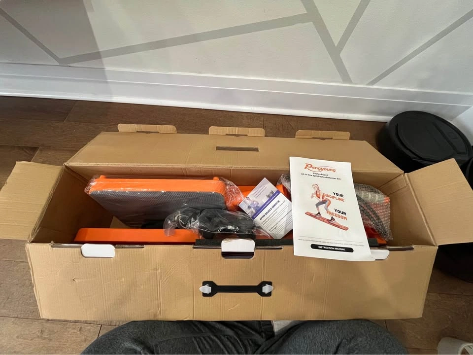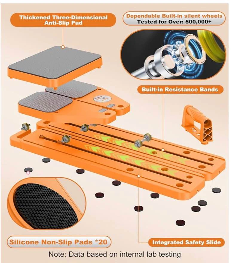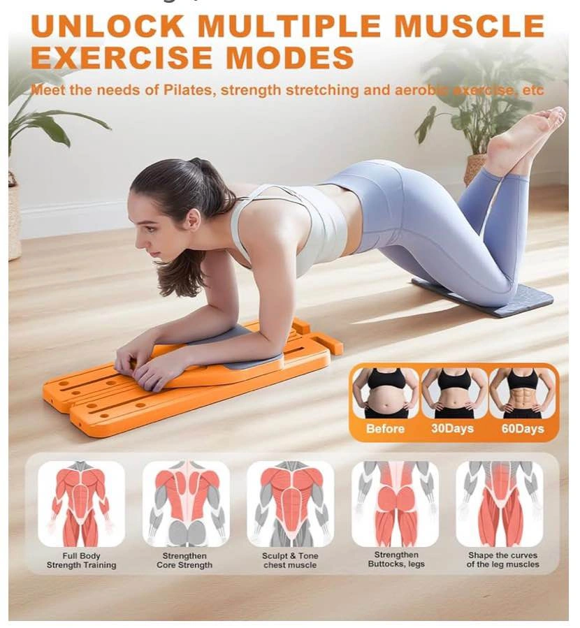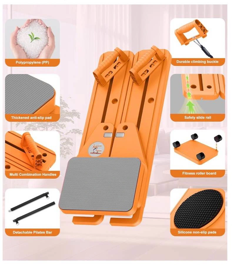 This is a new, open-box Pilates Board, a 12-in-1 Mini Pilates Reformer Set that's multifunctional and portable for home workouts. It comes in Cosmic Orange. You can customize your workout according to your needs, following the professional user manual. Combine freely according to exercise requirements (Pilates board + Fitness roller board, Multi Combination Handles + Resistance Bands, Detachable Pilates Bar + Resistance Bands, Fitness roller board + Universal pulley * 4). After recombination, it can form over 20 training forms, achieving over 100 targeted movements. You can combine two separate Pilates reformers pieces to form a single straight line, unlocking a simulated ski machine mode. The set can comprehensively exercise muscles of the back, abdomen, hips, arms, legs, pelvic floor, and enhance core strength. The board gradually adjusts resistance levels for different fitness goals. Made of high-quality polypropylene (PP) material with a maximum load capacity of 500 lb. It's wear-resistant, has better anti-oxidation performance, and a longer service life. Equipped with 20 silicone anti-slip pads for safety and stability. The high-precision silent bearing (<35 db) can withstand over 500,000 cycles. The integrated track design resolves the issue of wheels getting stuck. It comes with two independent adjustable plates. You can freely adjust spacing and angle according to your shoulder width and height, unlocking more exercise modes. A single set meets most fitness needs and can be used without tools. It integrates a simulated ski machine, pull-up/push-up stretch device, leg trainer, climbing machine, treadmill, plank board, shaping arm device, resistance bands, and upper body trainer.