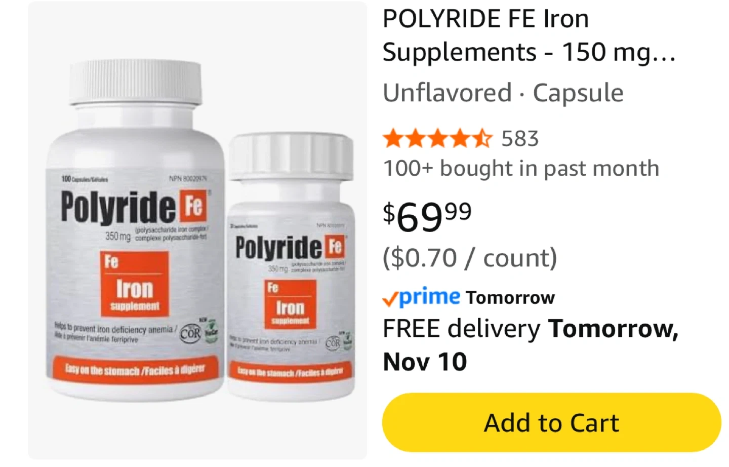 Buy & Sell🥕 Polyride Fe Iron Supplement 350mg🥕 Polyride Fe Iron Supplement 350mg$20Selling a bottle of Polyride Fe Iron Supplement, each capsule contains 350mg. It helps prevent iron deficiency anemia. Easy on the stomach!BrandPolyrideWHERE TO MEETForestlawnView MapSELLERverifiedCool guySoutheast Calgary44229 reviews0 chats·0 favorites·10 viewsSEND CHAT TO SELLERHi Cool guy! I’m interested in your listing.Hi Cool guy! I’m interested in your listing.Get the Karrot app to chatSign In to chat