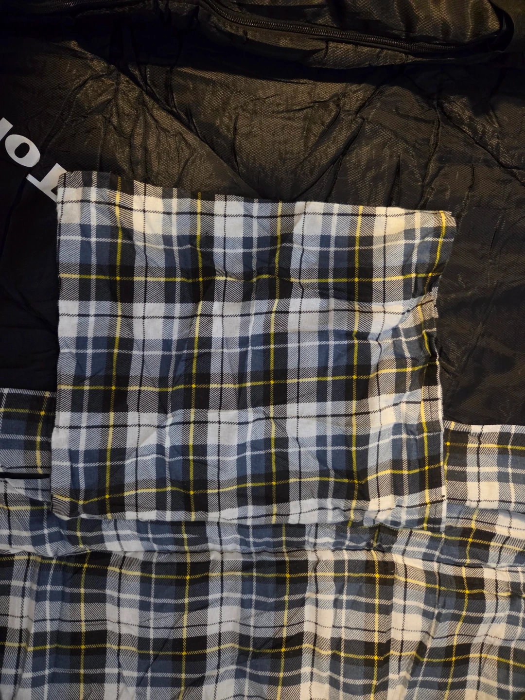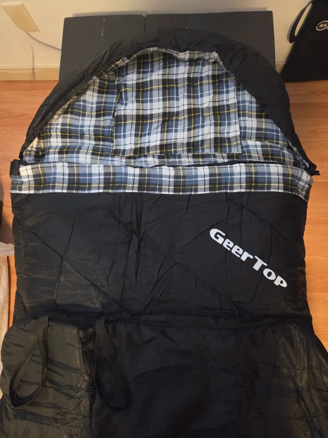 This brand new GeerTop sleeping bag features a cozy plaid lining with built in pillow cover.