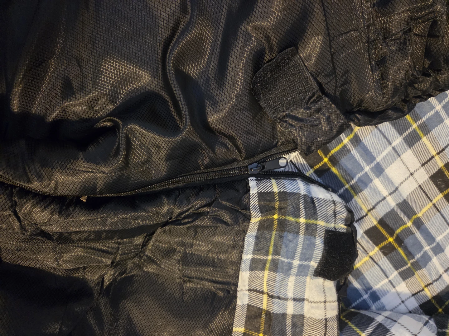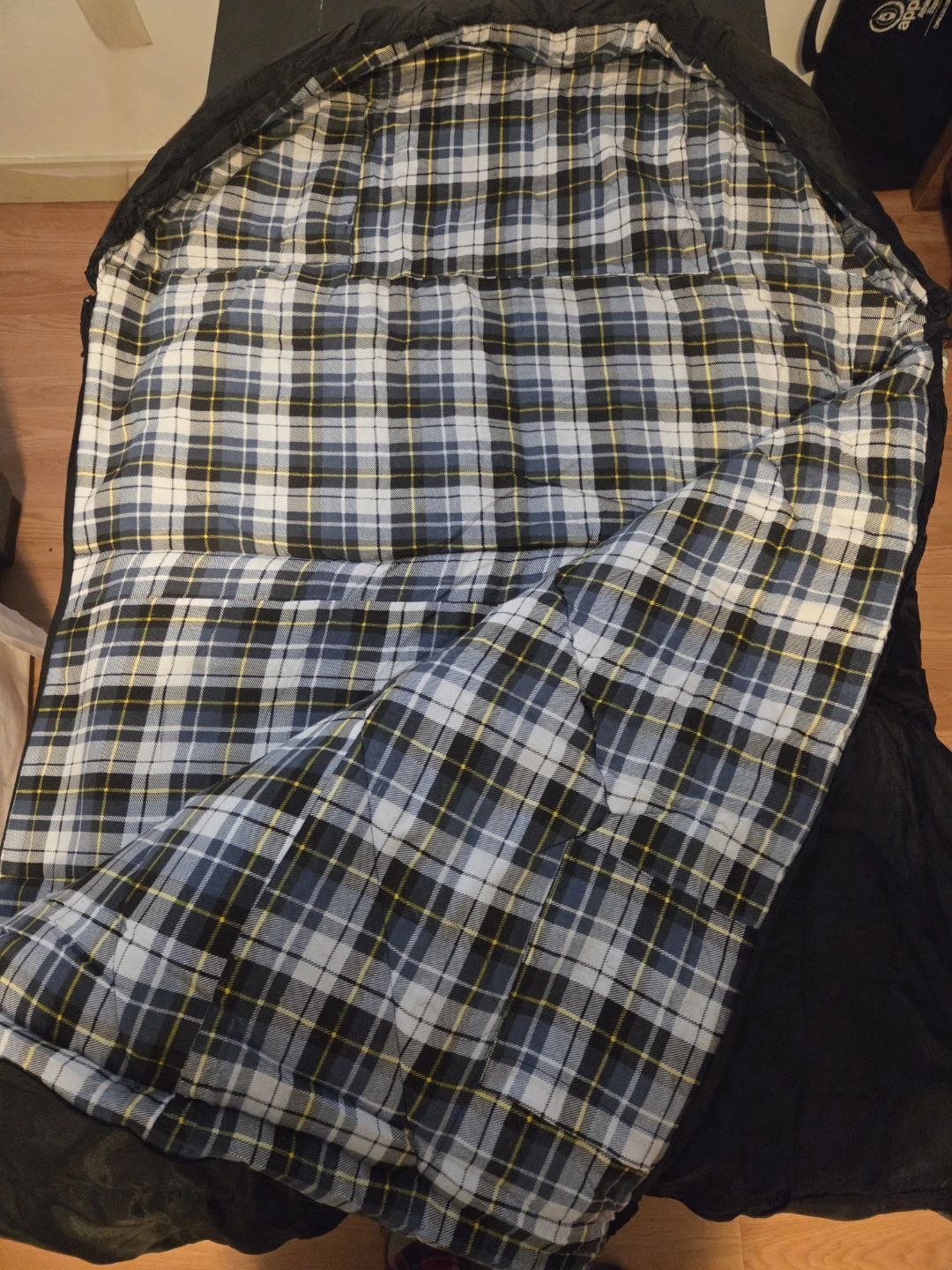 This brand new GeerTop sleeping bag features a cozy plaid lining with built in pillow cover.