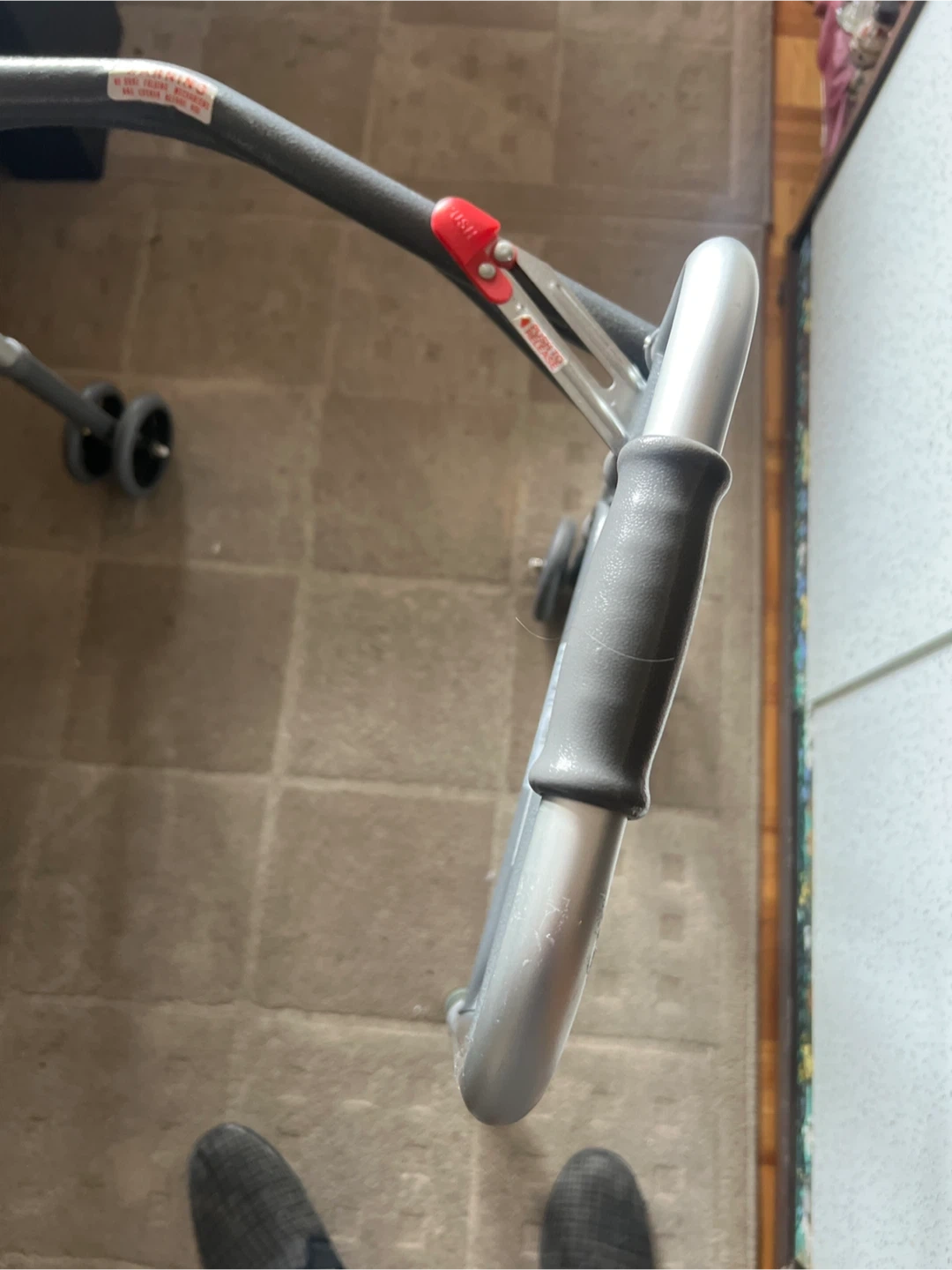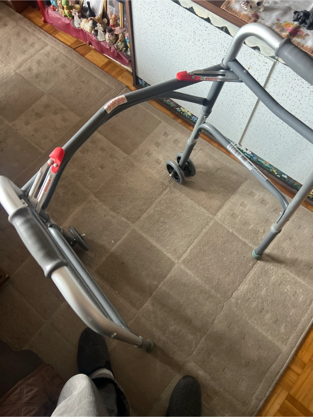 This is a folding walker with wheels for mobility assistance. It features comfortable hand grips and a lightweight aluminum frame. The walker folds for easy storage and transport. Great for anyone needing a bit of extra support while walking!… very good condition