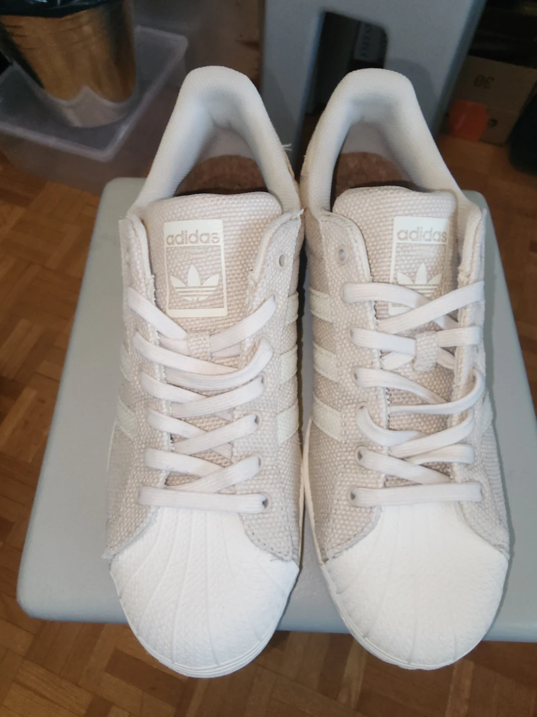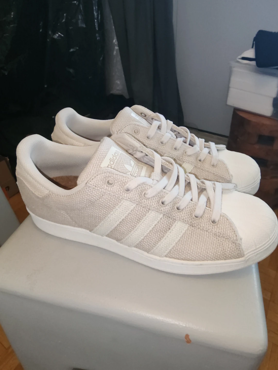 Selling a pair of Adidas Superstar Hemp sneakers in a cream white colour. These are a US size 10.5. They are in great condition and ready for their next adventure!