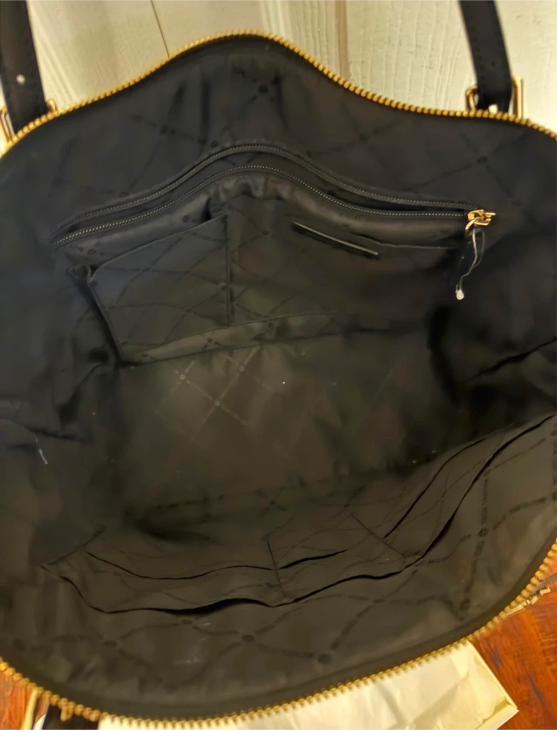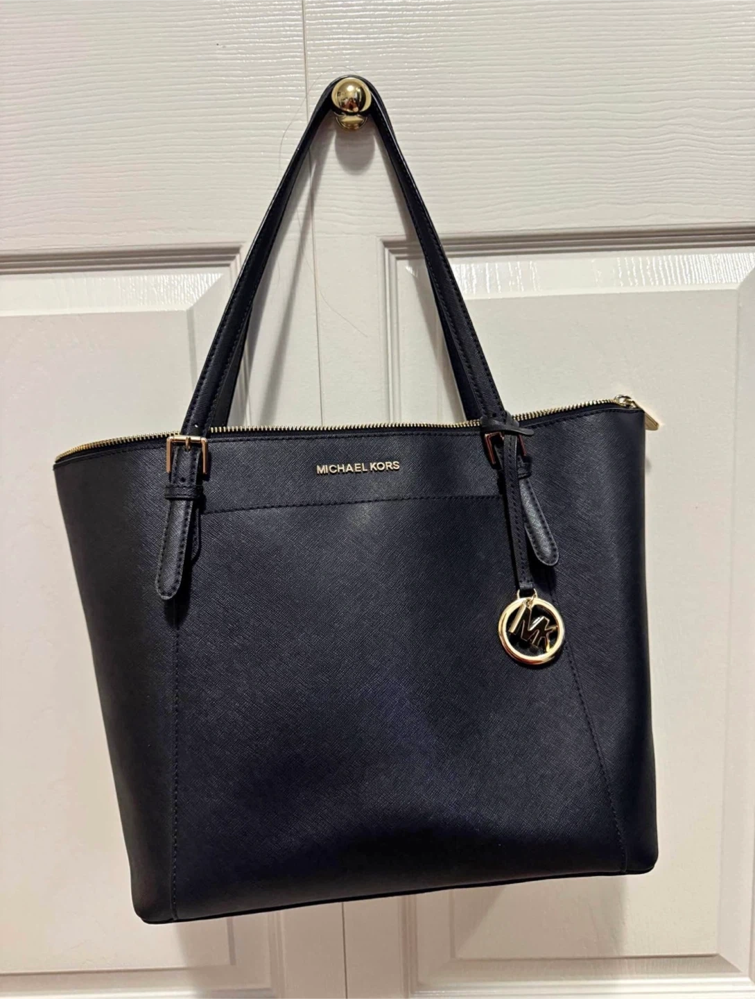 A classic black Michael Kors tote bag. It's made of saffiano leather and features a zip-top closure.