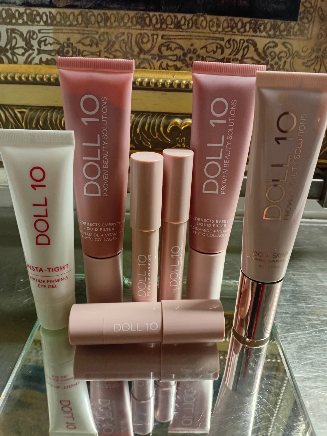" MAKE ME ON OFFER " This is a collection of Doll 10 beauty products. It includes Insta-Tight Peptide Firming Eye Gel and other liquid filters. These products are formulated with niacinamide and phyto collagen. The Doll Skin Anti-Stress Primer is also included.647-657-7225 contact Jessica