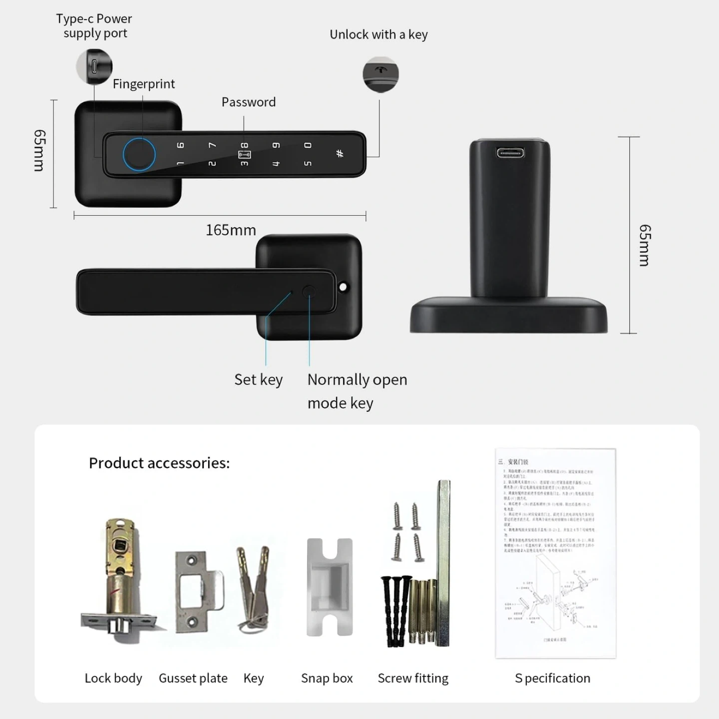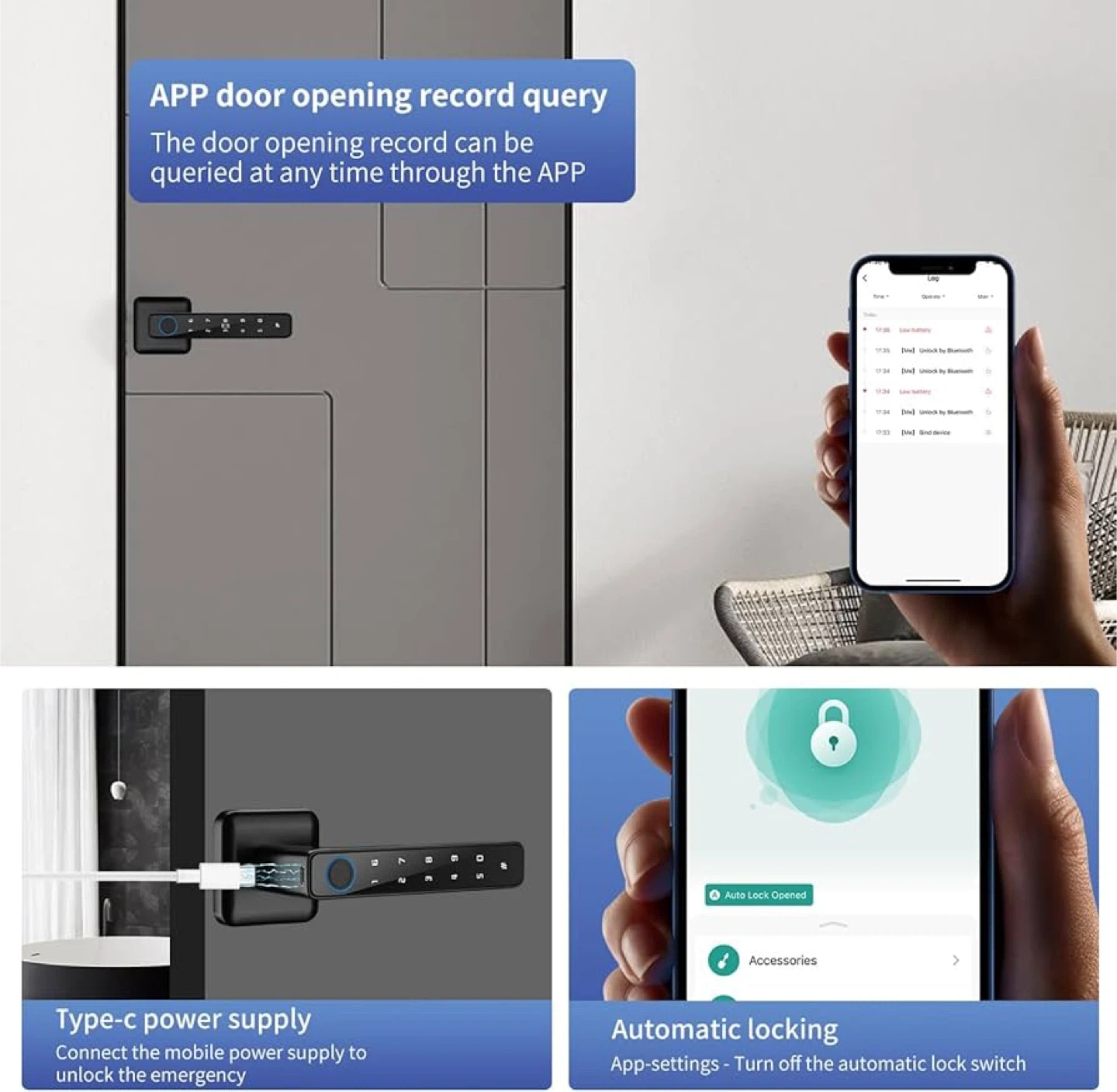 This smart door lock offers keyless entry with fingerprint or keypad access. It features automatic locking and an app for door opening record queries. The lock supports Type-C power supply for emergency unlocking.