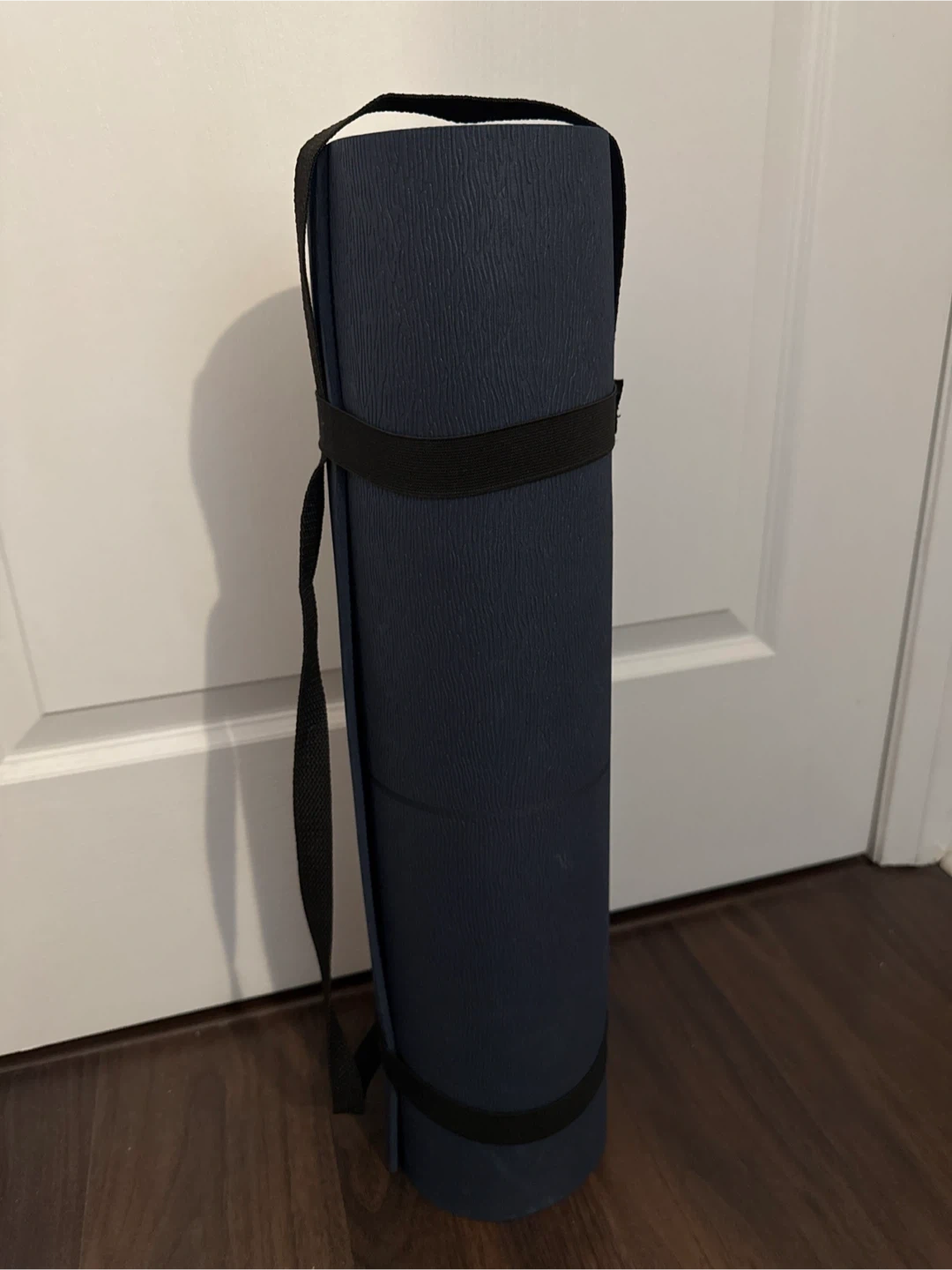 This dark blue yoga mat rolls up for easy storage and transport. It includes an elastic strap to keep it secure and a black fabric carrying strap. Textured surface for grip.