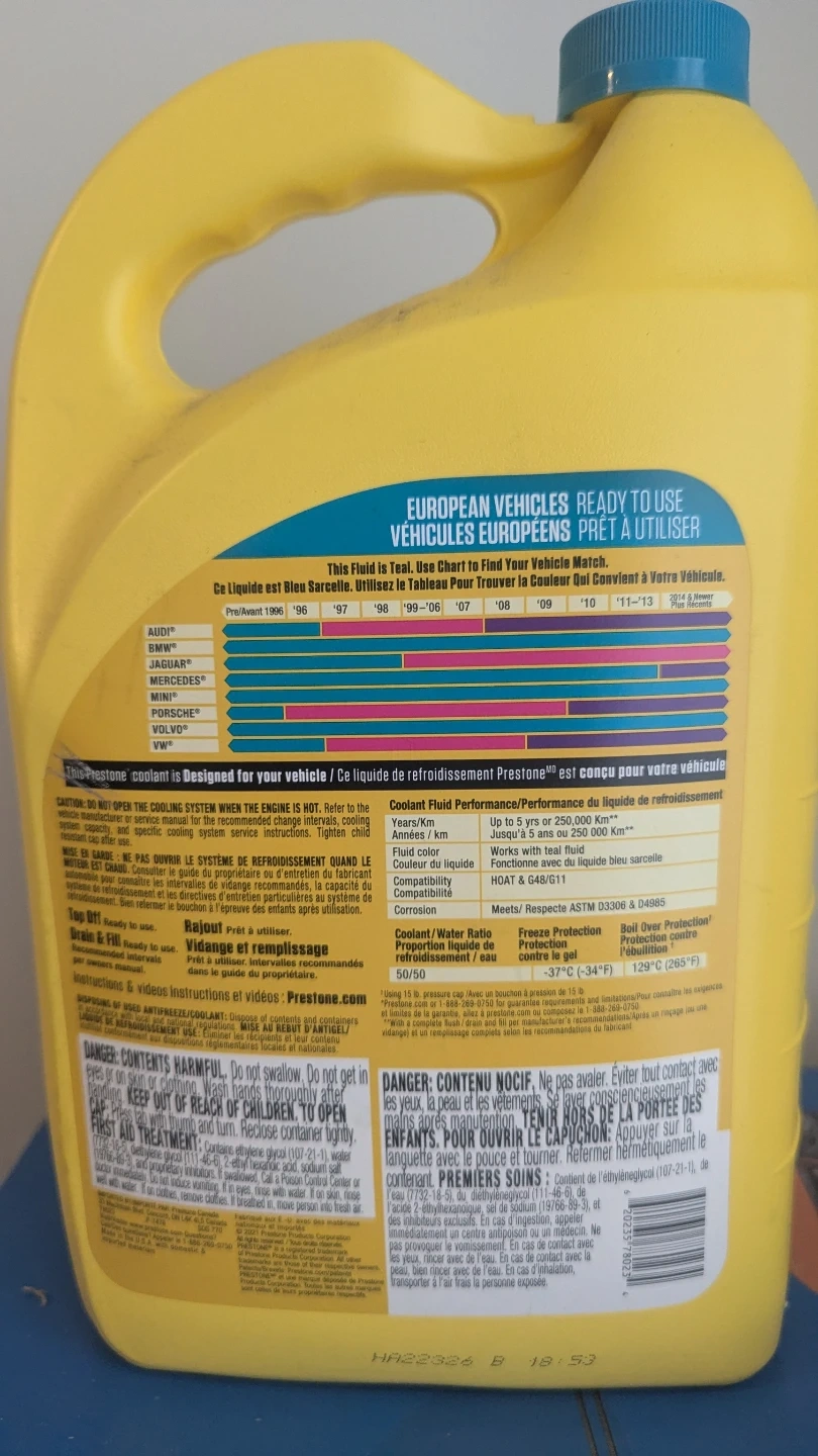 This is a 3.78 L jug of Prestone Antifreeze + Coolant. It's designed for European vehicles and offers 5-year/250,000 km protection. Do not add water; use as 50/50 premixed.