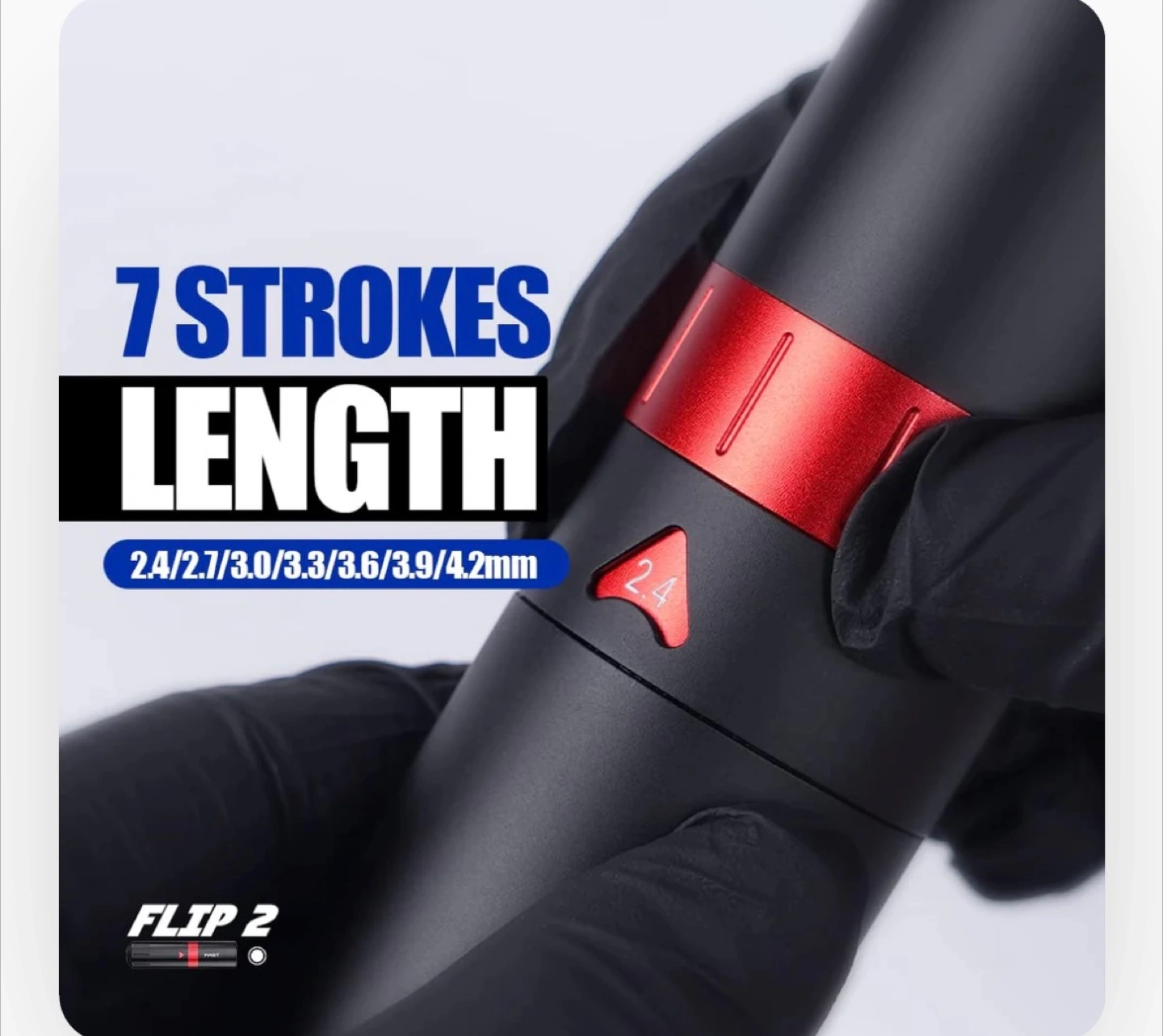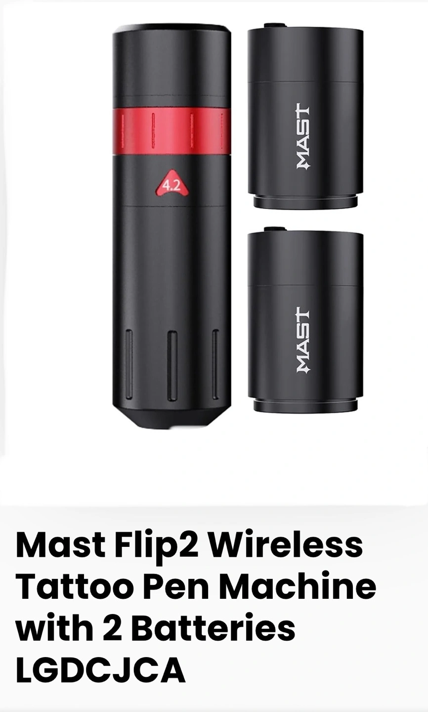 Selling a Mast Flip 2 Wireless Tattoo Pen Machine. It features a high capacity battery with 1700 mAh, providing a long working duration of 4-6 hours. When power depletion occurs, the RCA connector can be replaced, making work easier. The stroke length is adjustable with 7 strokes length: 2.4/2.7/3.0/3.3/3.6/3.9/4.2mm