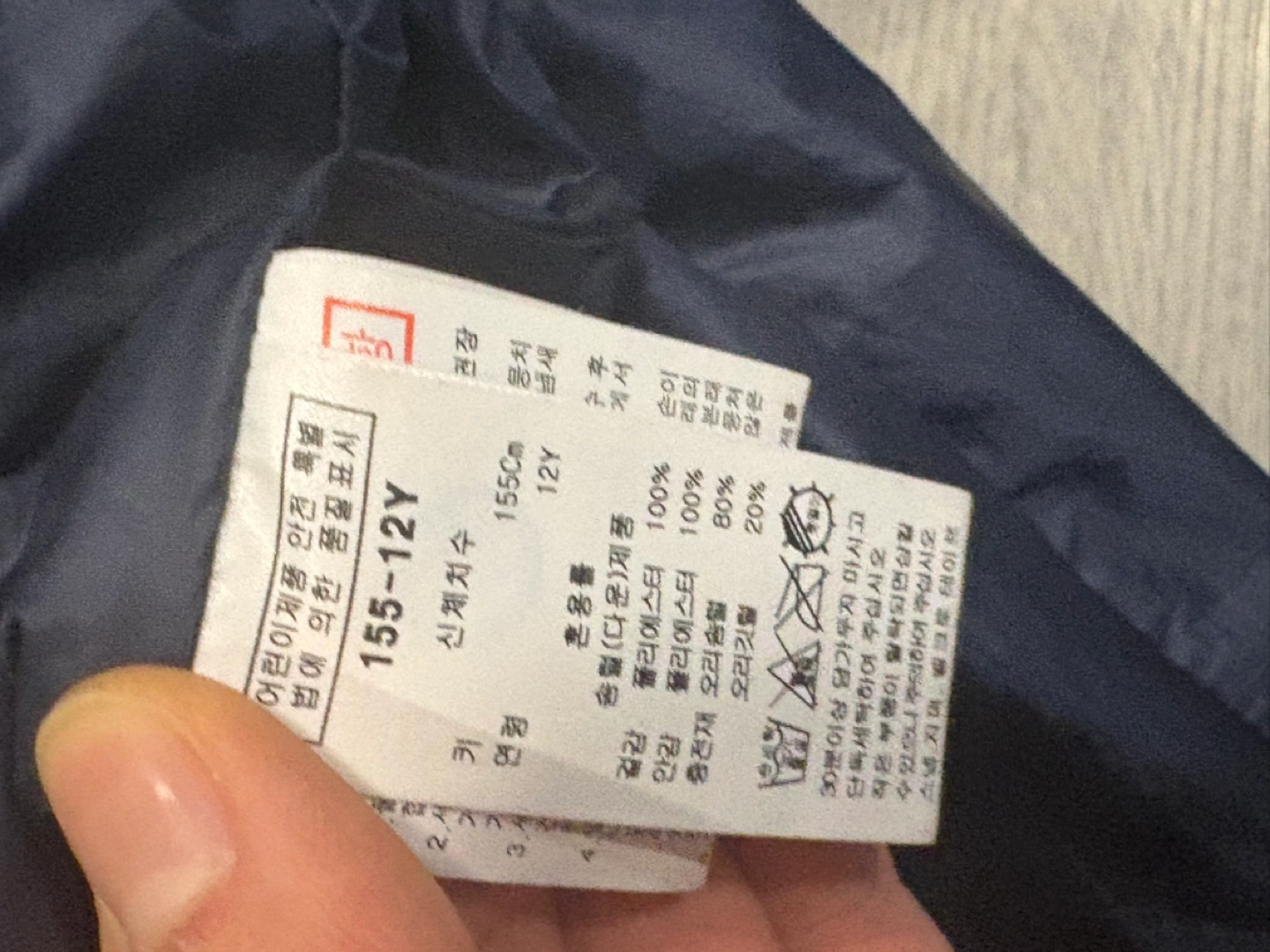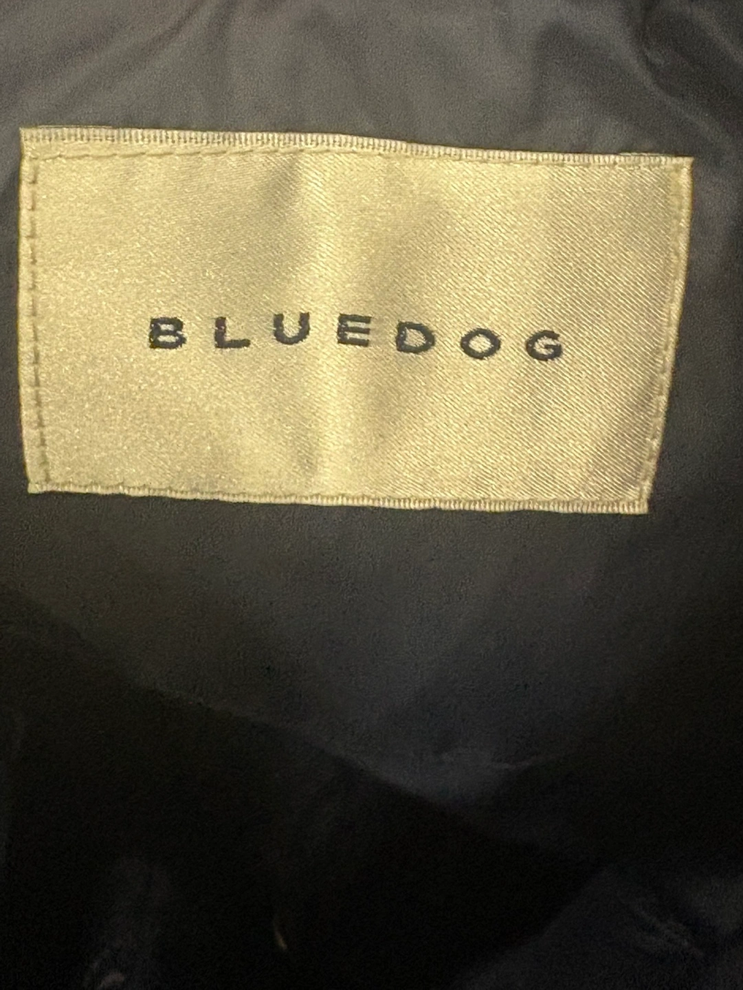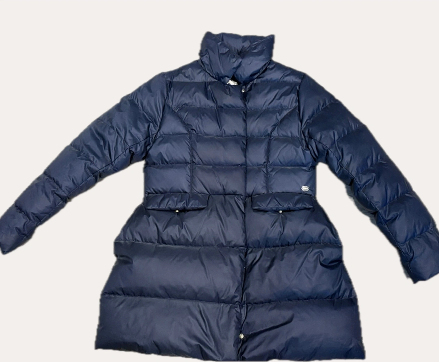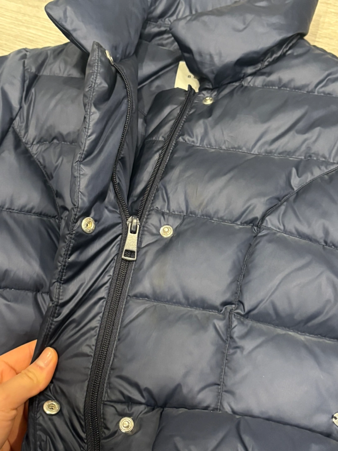 Stylish navy blue puffer coat. Size 12Y. Features a stand-up collar, front zipper closure, and snap buttons. Long sleeves. Excellent for colder weather.