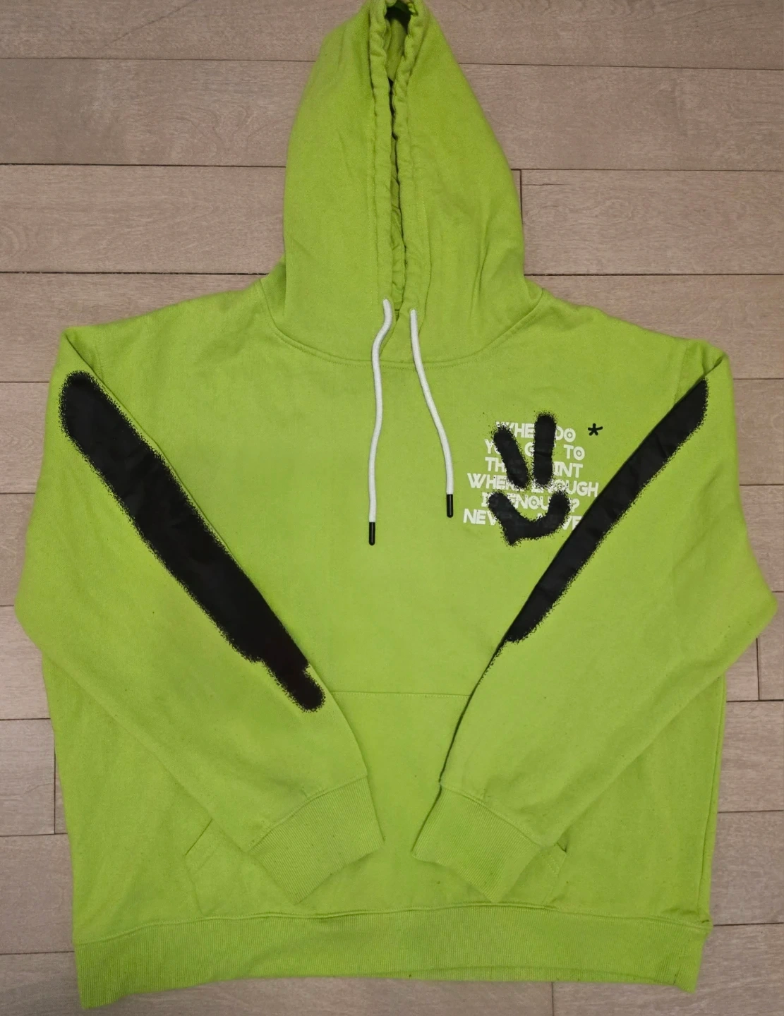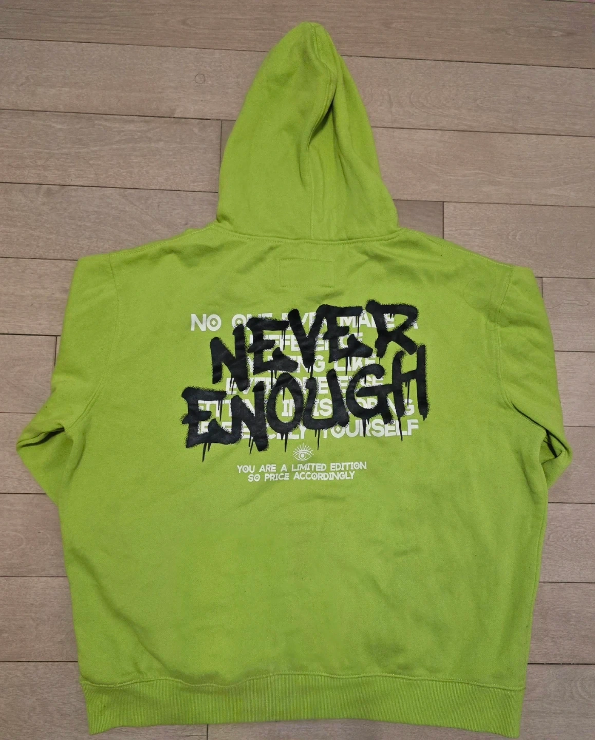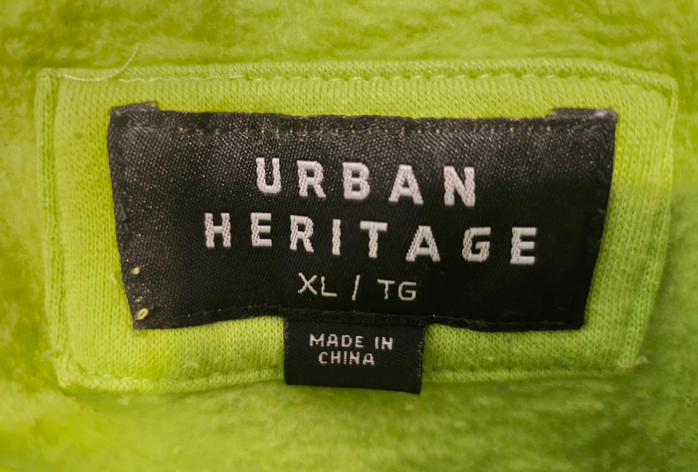 Selling a vibrant neon lime green hoodie from Urban Heritage. It features a cool black graffiti-style graphic on the back and sleeves.