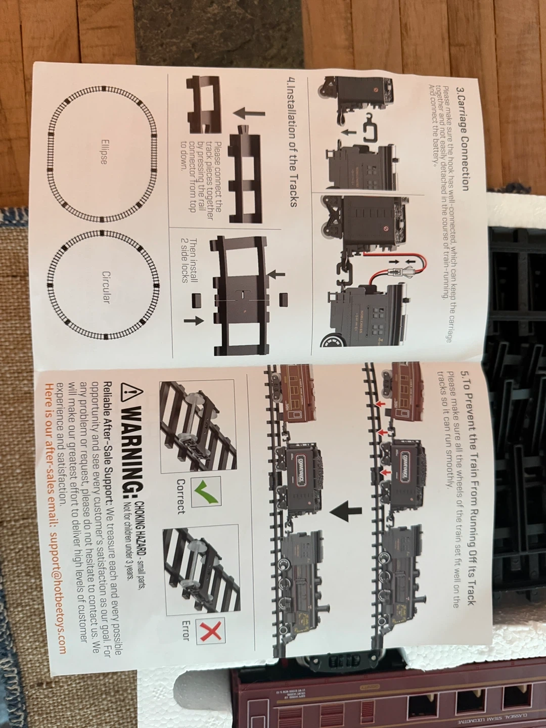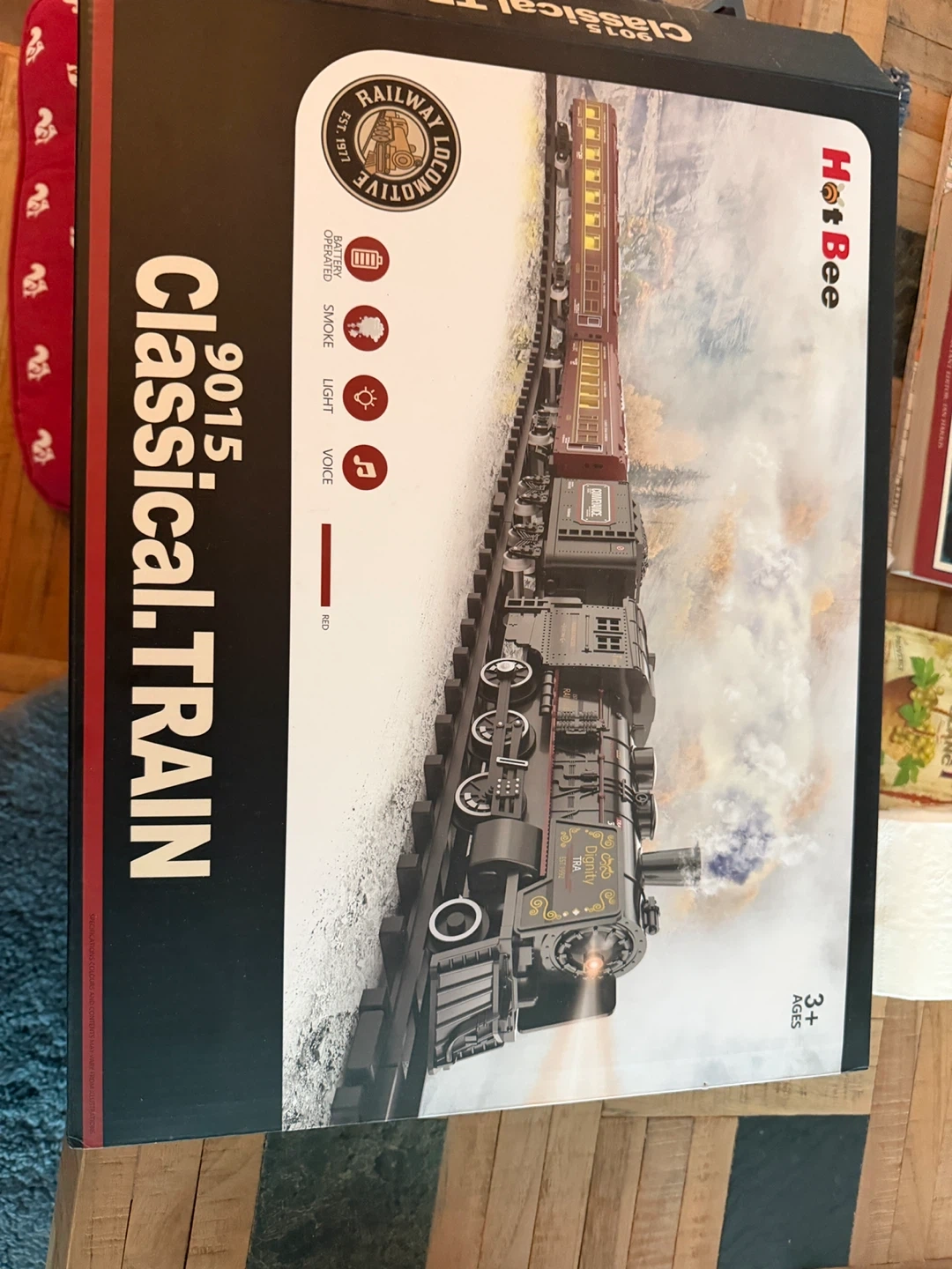 This is a Hot Bee 9015 Classical Train Set with smoke and light functions. It's designed for ages 3 and up. The set includes a locomotive, carriages, and track pieces for assembly. It runs on battery power and can be charged via USB.