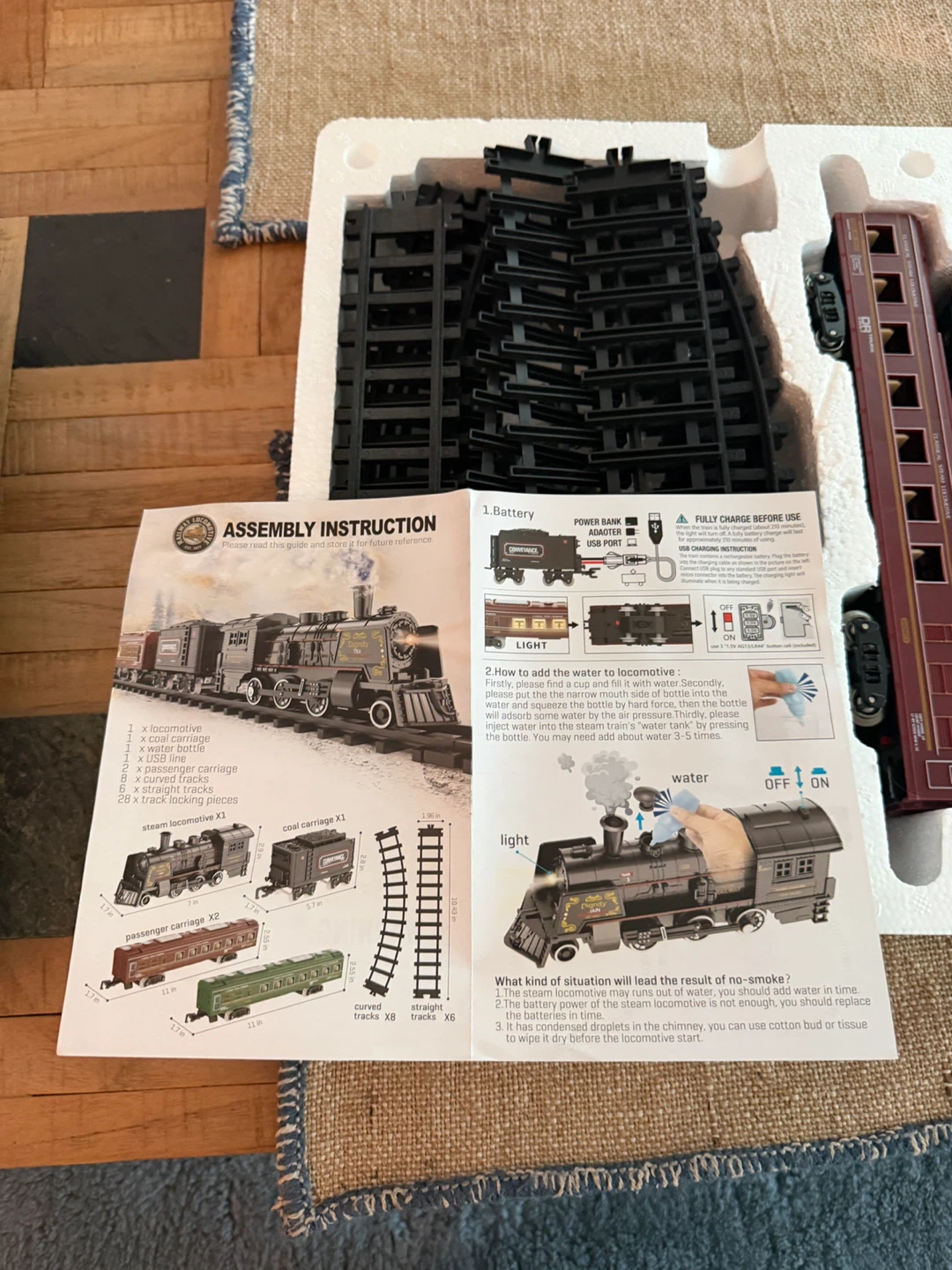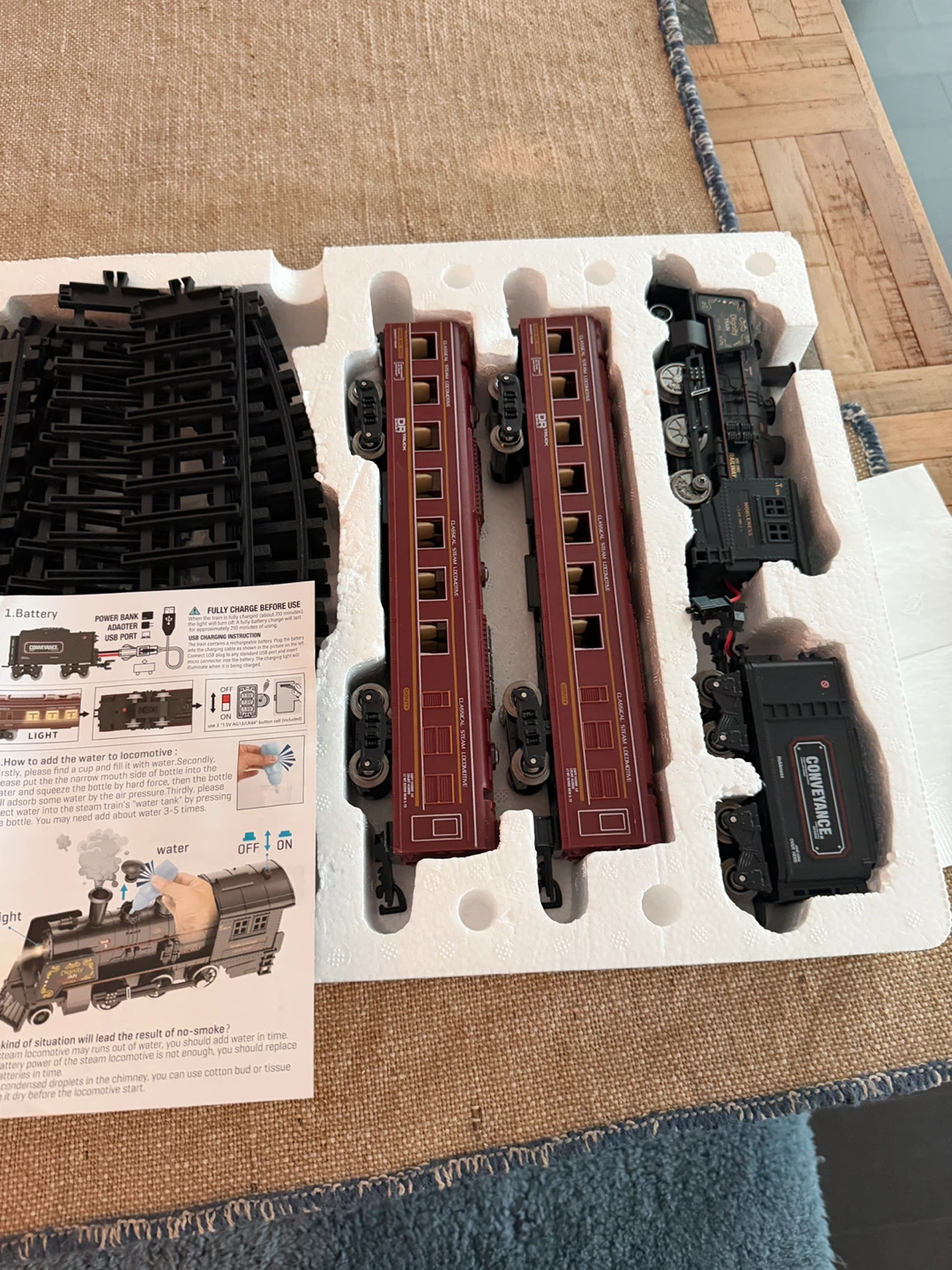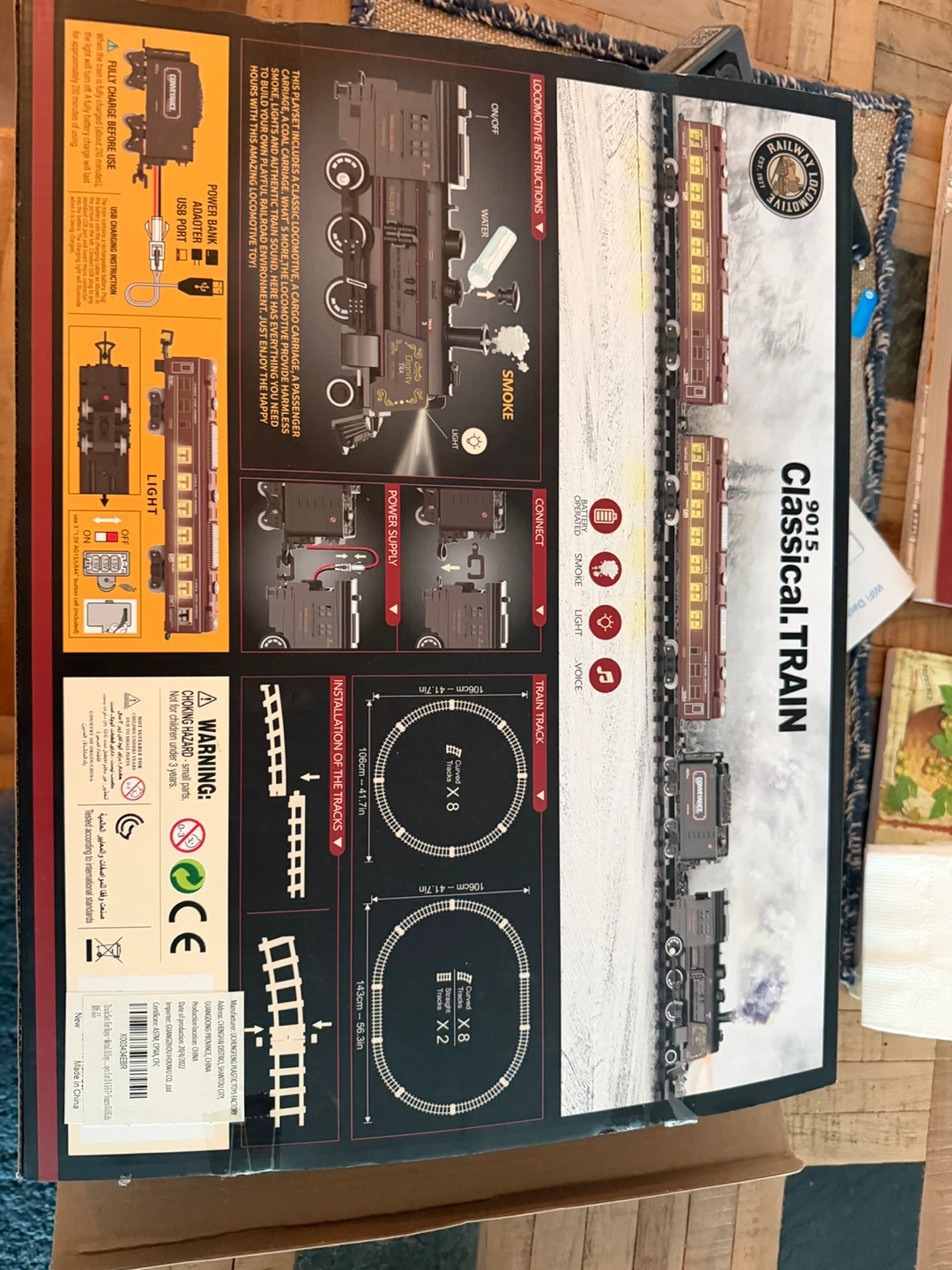 This is a Hot Bee 9015 Classical Train Set with smoke and light functions. It's designed for ages 3 and up. The set includes a locomotive, carriages, and track pieces for assembly. It runs on battery power and can be charged via USB.
