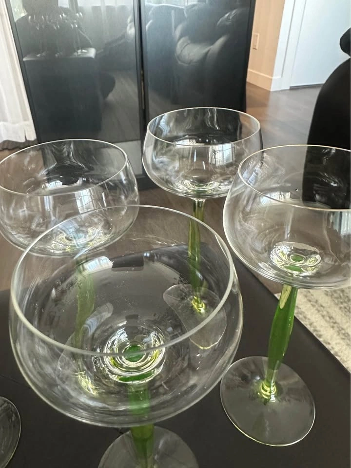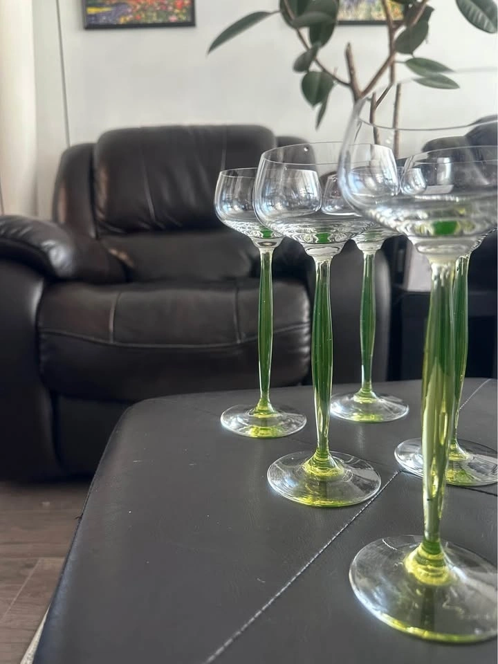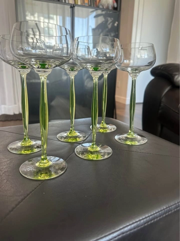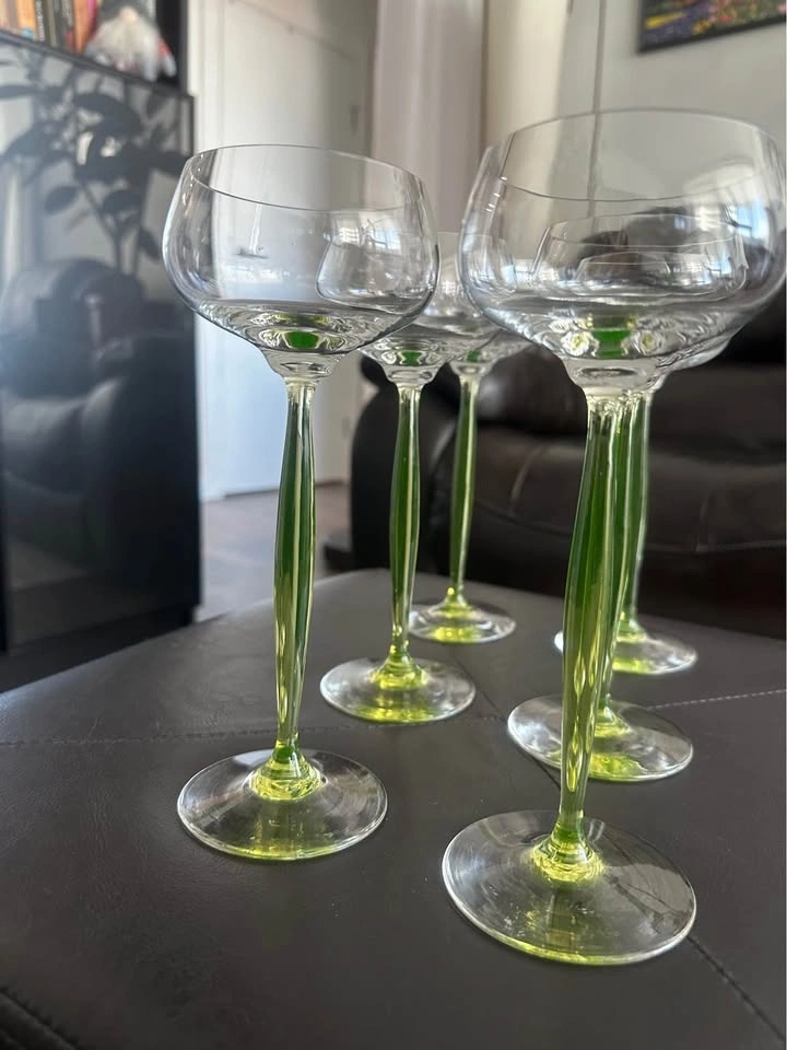 Elegant vintage Art Deco uranium glass wine glasses with rare chartreuse green stems. These are classic hock / roemer (cordial) glasses, highly sought after by collectors of early 20th-century European glass. The glasses feature air-blown, opalescent uranium glass stems that glow under UV light, paired with clear rounded bowls — a timeless and very refined silhouette. Style: Art Deco / Art Nouveau transition. Era: Early 20th century (circa 1900–1920). Origin: France (attributed style). Material: Uranium glass (green stems). Type: Hock / Roemer / Cordial glasses. Quantity: Set of 6. Stem color: Chartreuse green. Technique: Air-blown stems. Condition: Excellent vintage condition, no chips or cracks. These glasses are versatile and can be used for wine, cocktails, champagne, or cordials, but they also display beautifully as a collector’s set. Similar designs have been attributed to designers such as Hans Christiansen for Theresienthal, reflecting the refined European glassmaking tradition of the period. Please message with any questions.