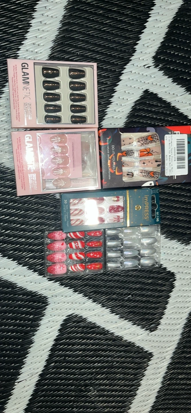 Get festive with these press-on nails! Includes Glamnetic solid black, Glamnetic skeleton, DO-IT-YOURSELF Halloween designs with spiders and pumpkins, and imPress Limited Edition holiday sets with candy cane, snowflake, and bow designs. Easy to apply for a quick festive look!