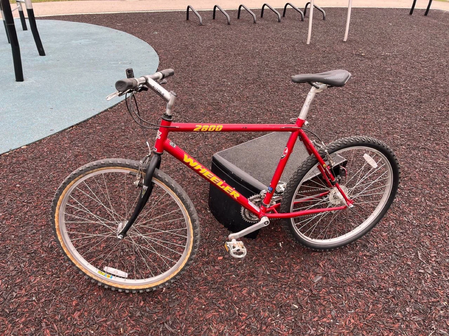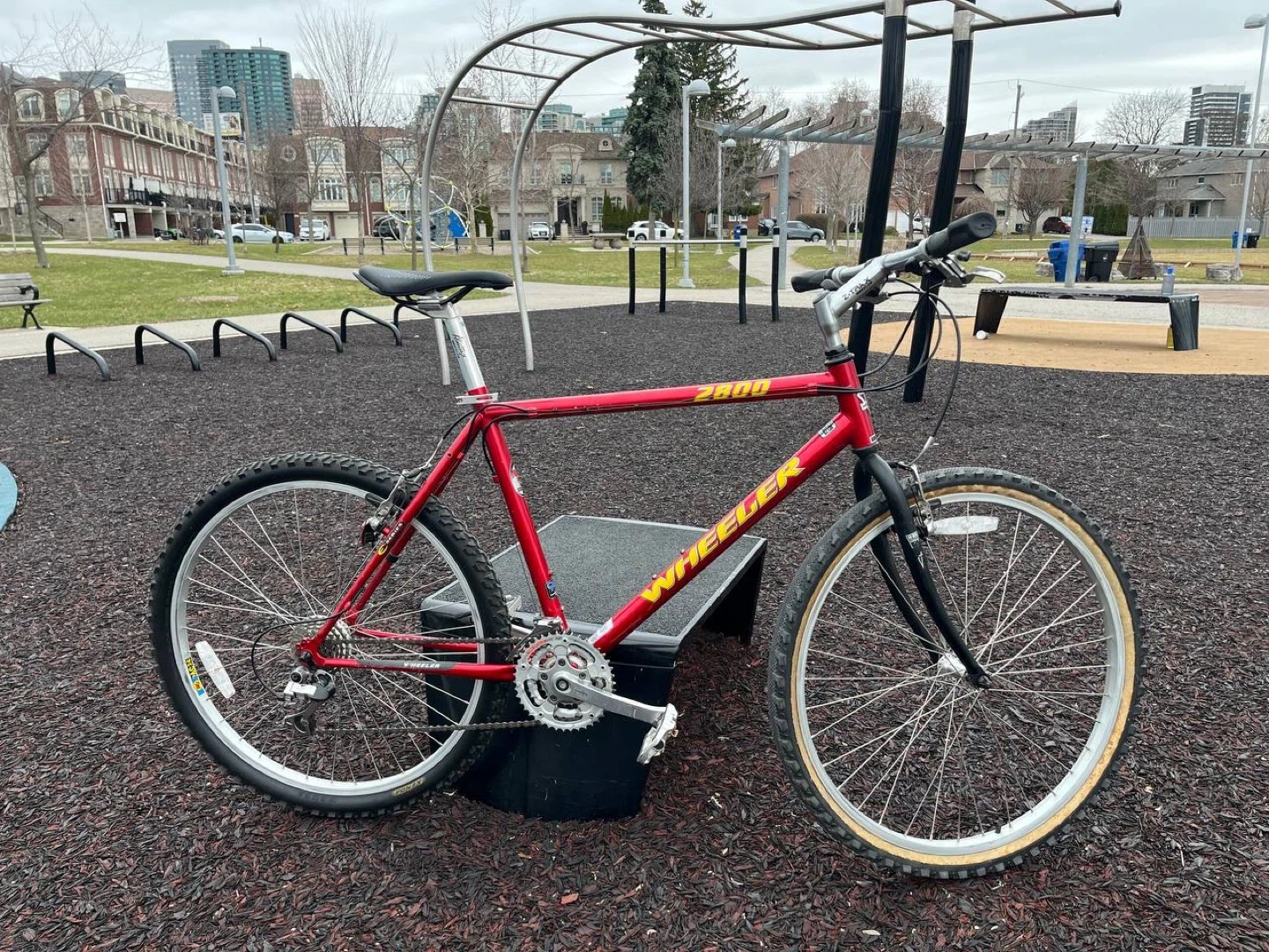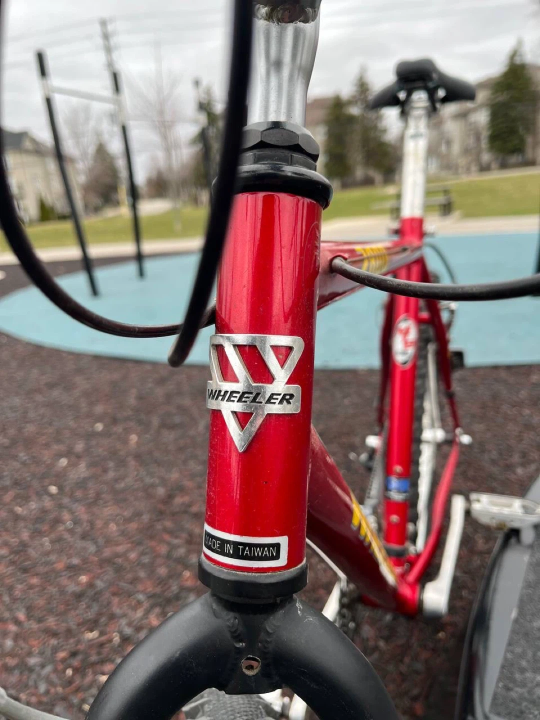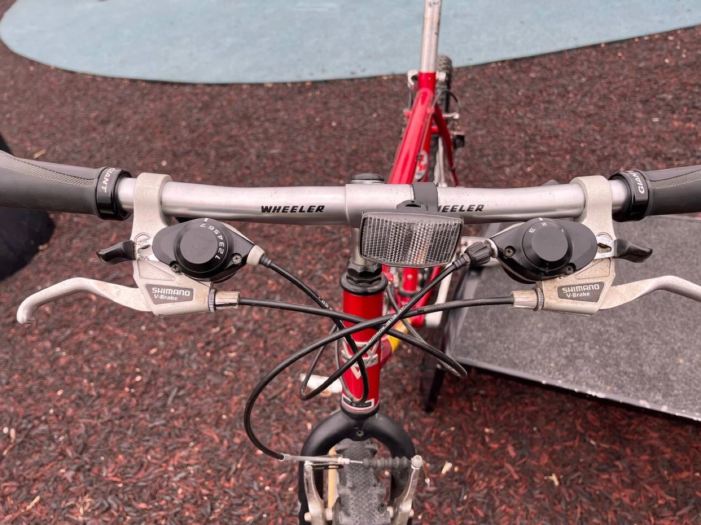 A red Wheeler 2800 mountain bike. It's made in Taiwan and features Shimano components. This bike is great for trail riding or just cruising around town!