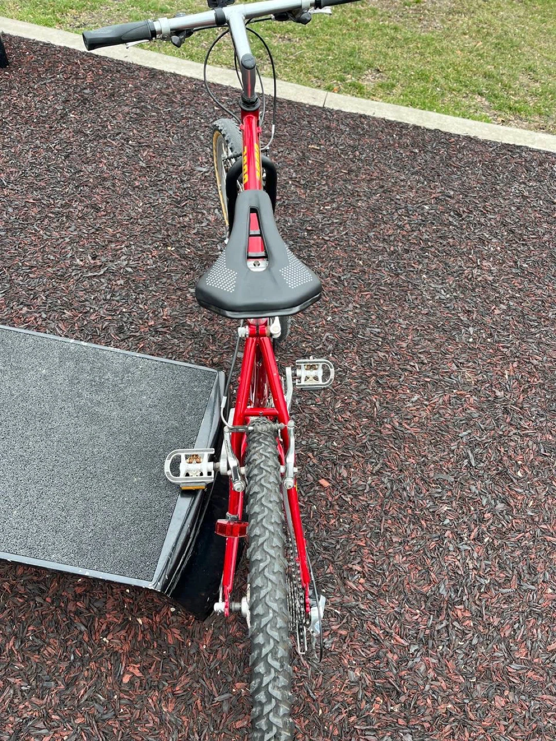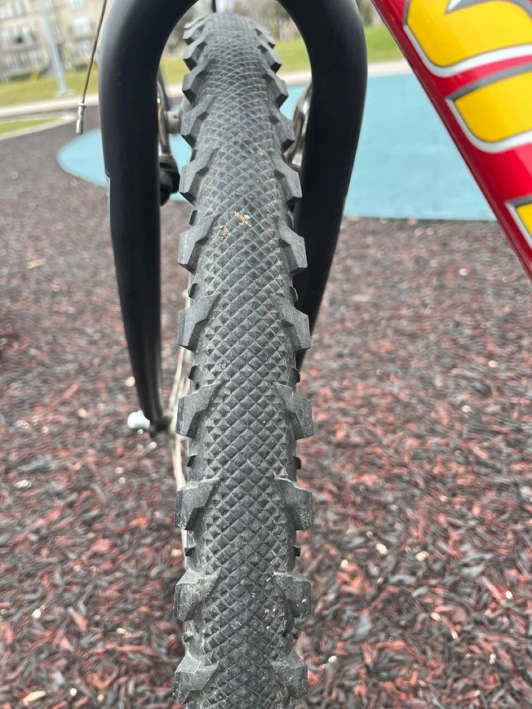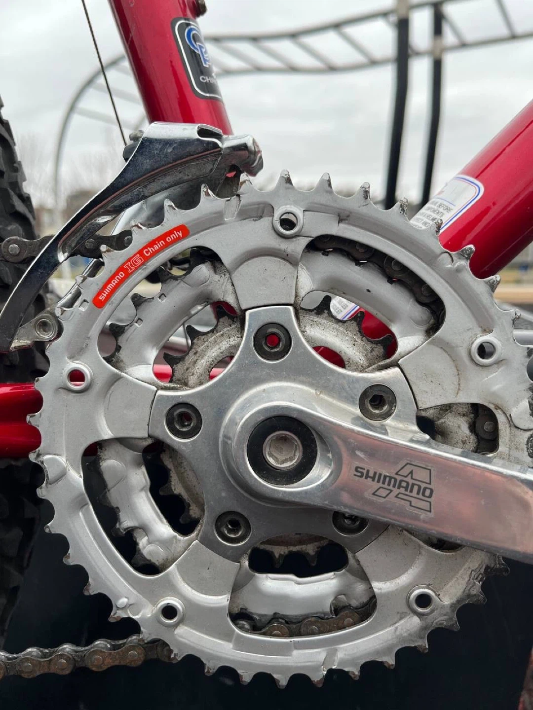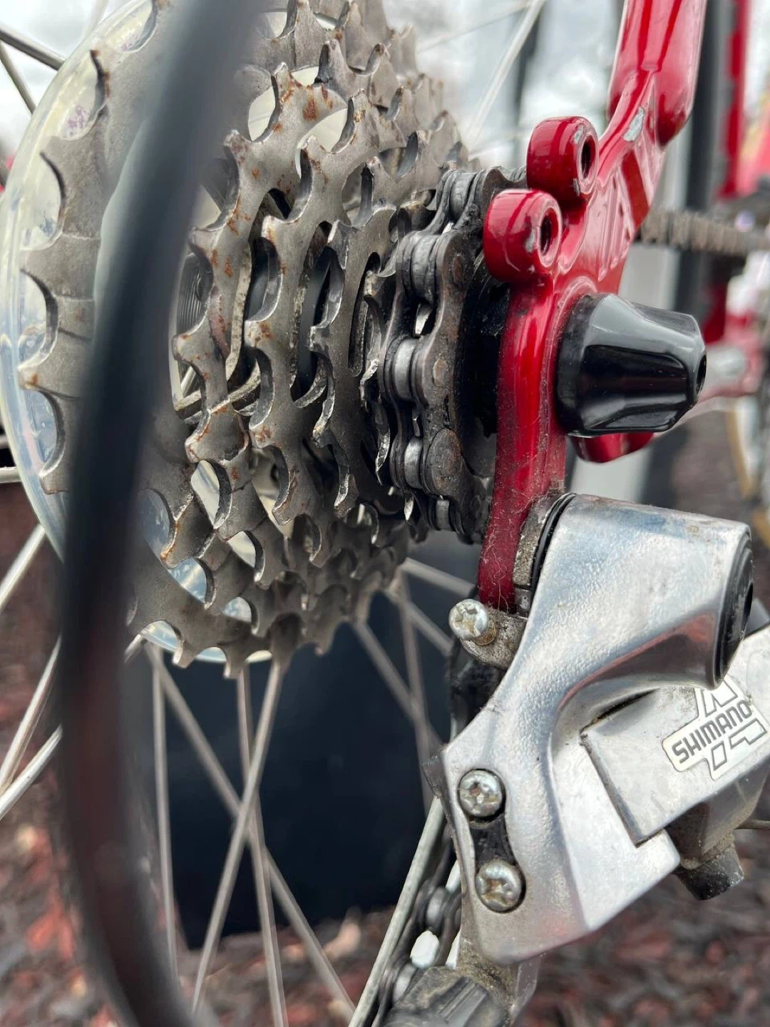 A red Wheeler 2800 mountain bike. It's made in Taiwan and features Shimano components. This bike is great for trail riding or just cruising around town!