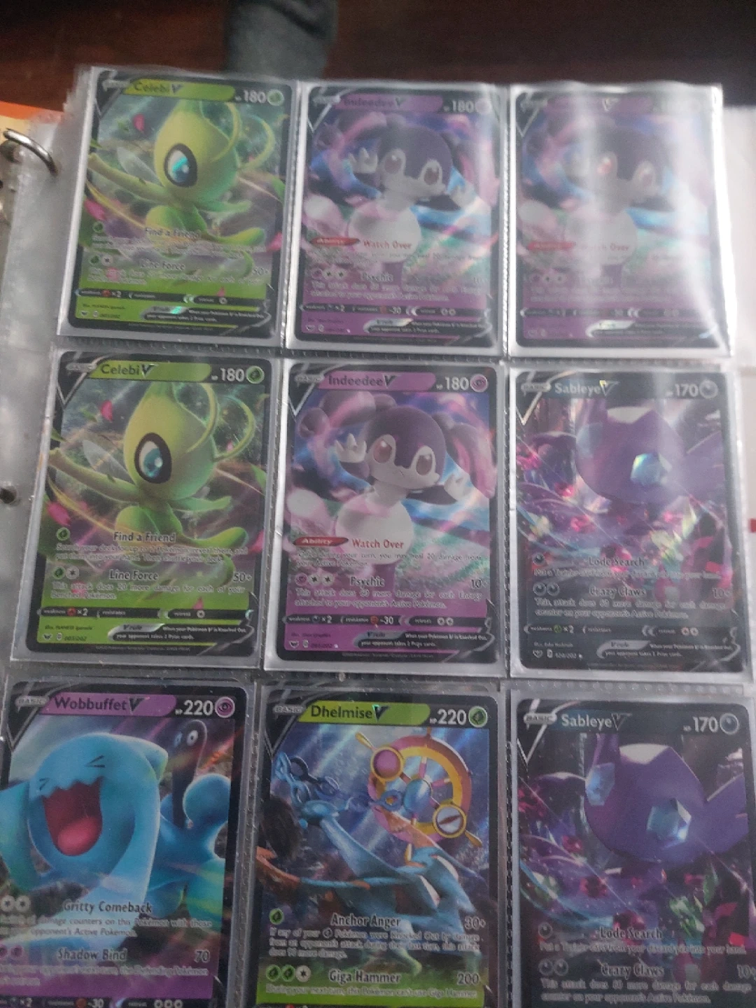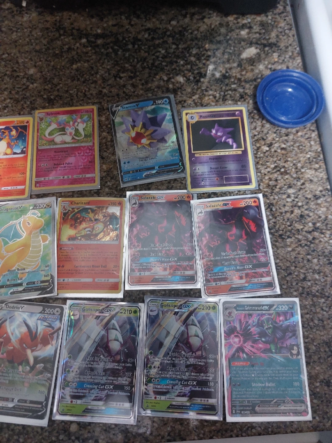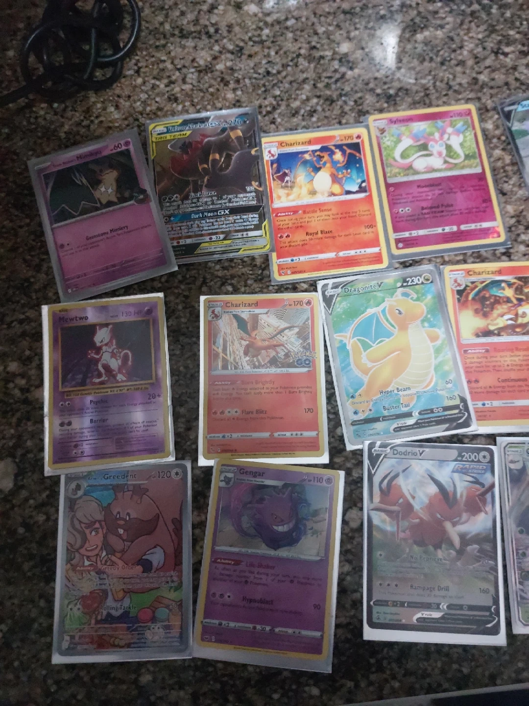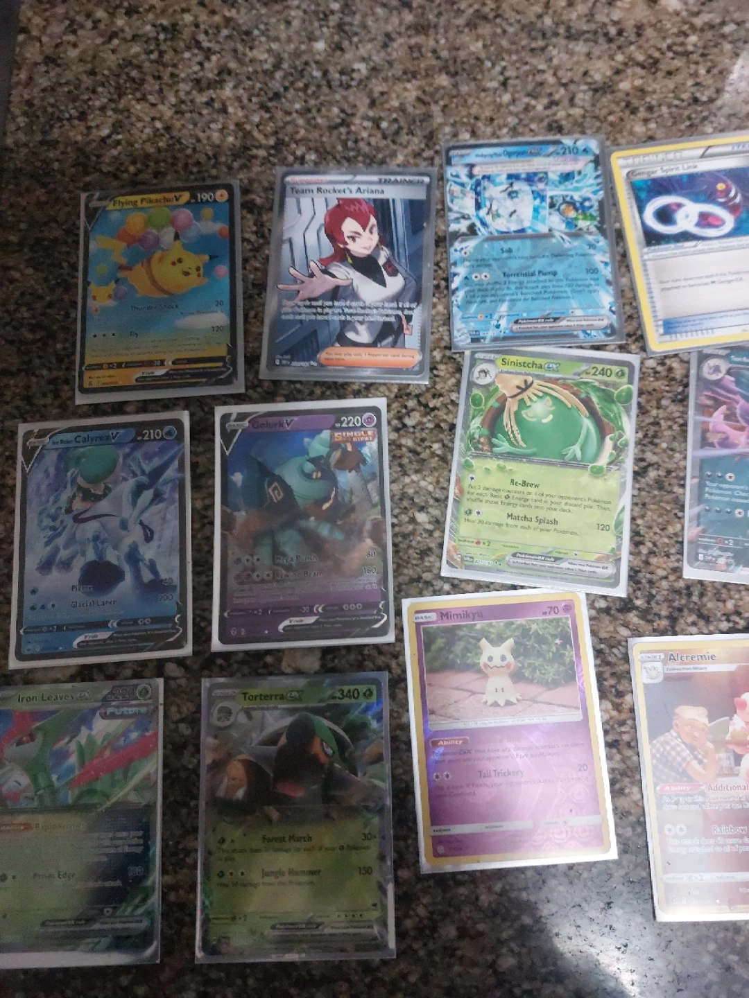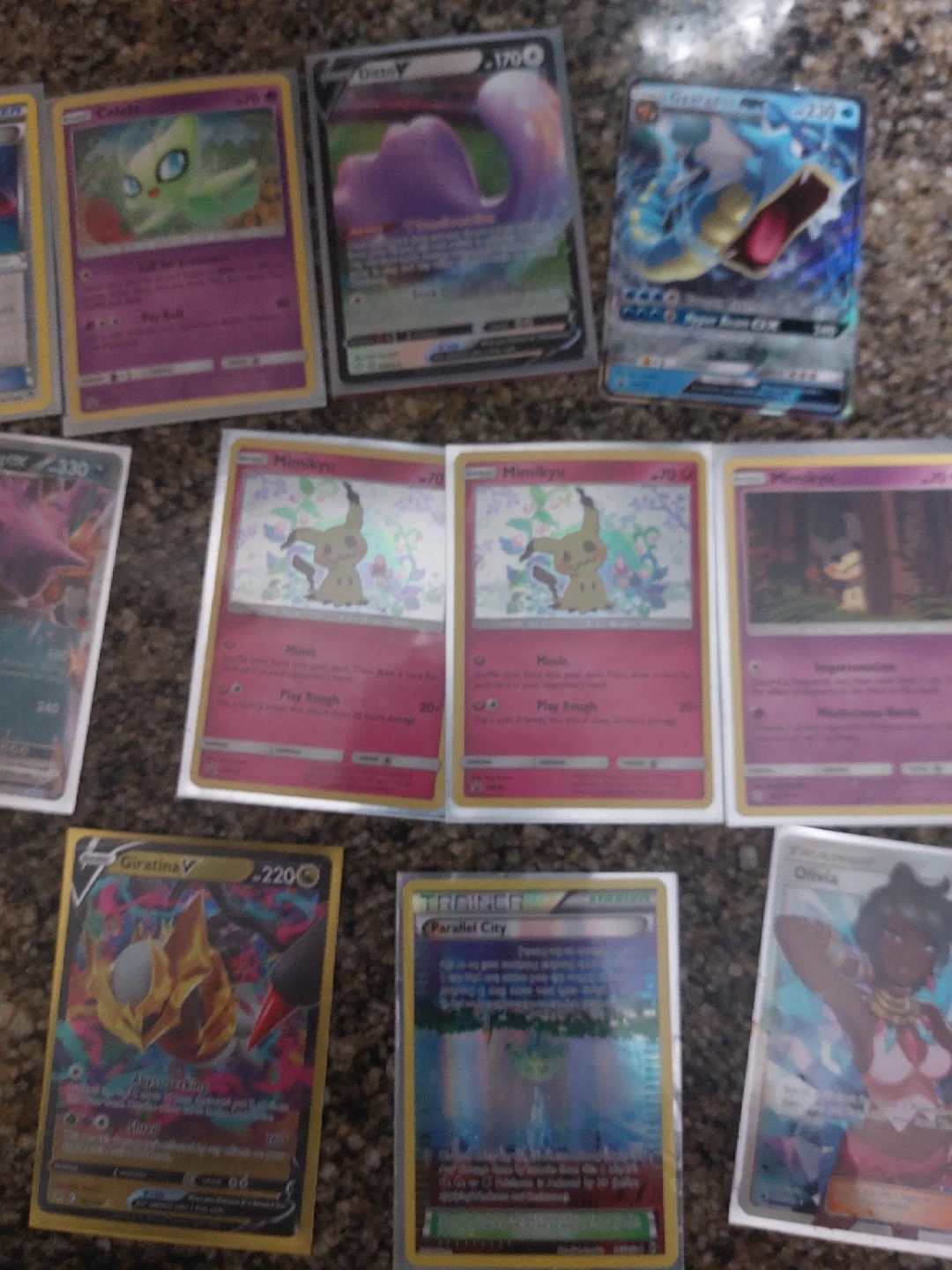 Collection of various Pokémon trading cards including V and EX cards. Includes characters like Giratina V, Mimikyu, Charizard, and more. Great for collectors!