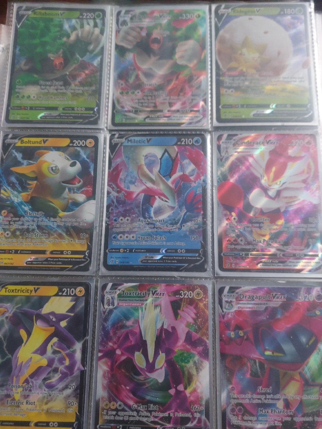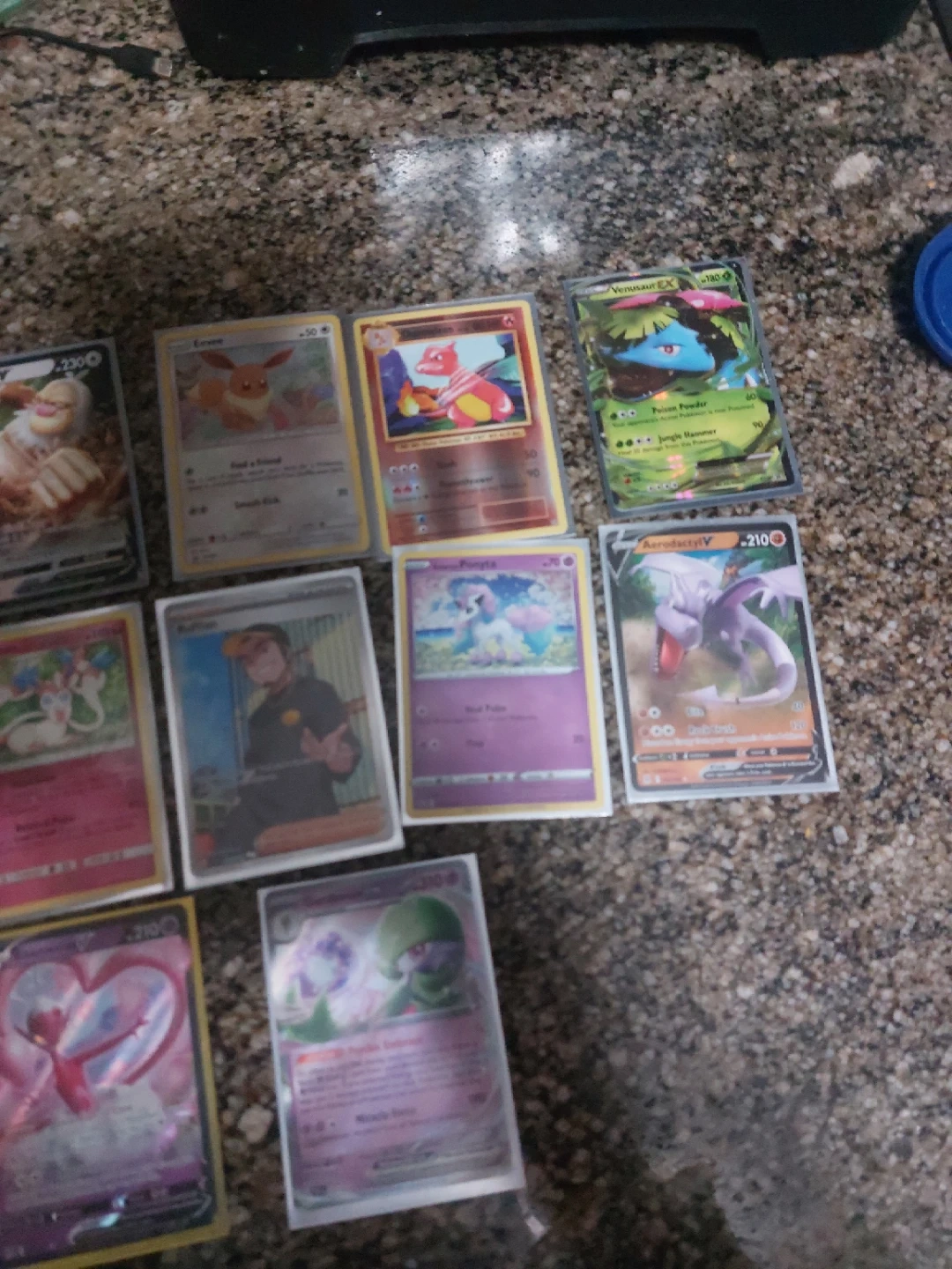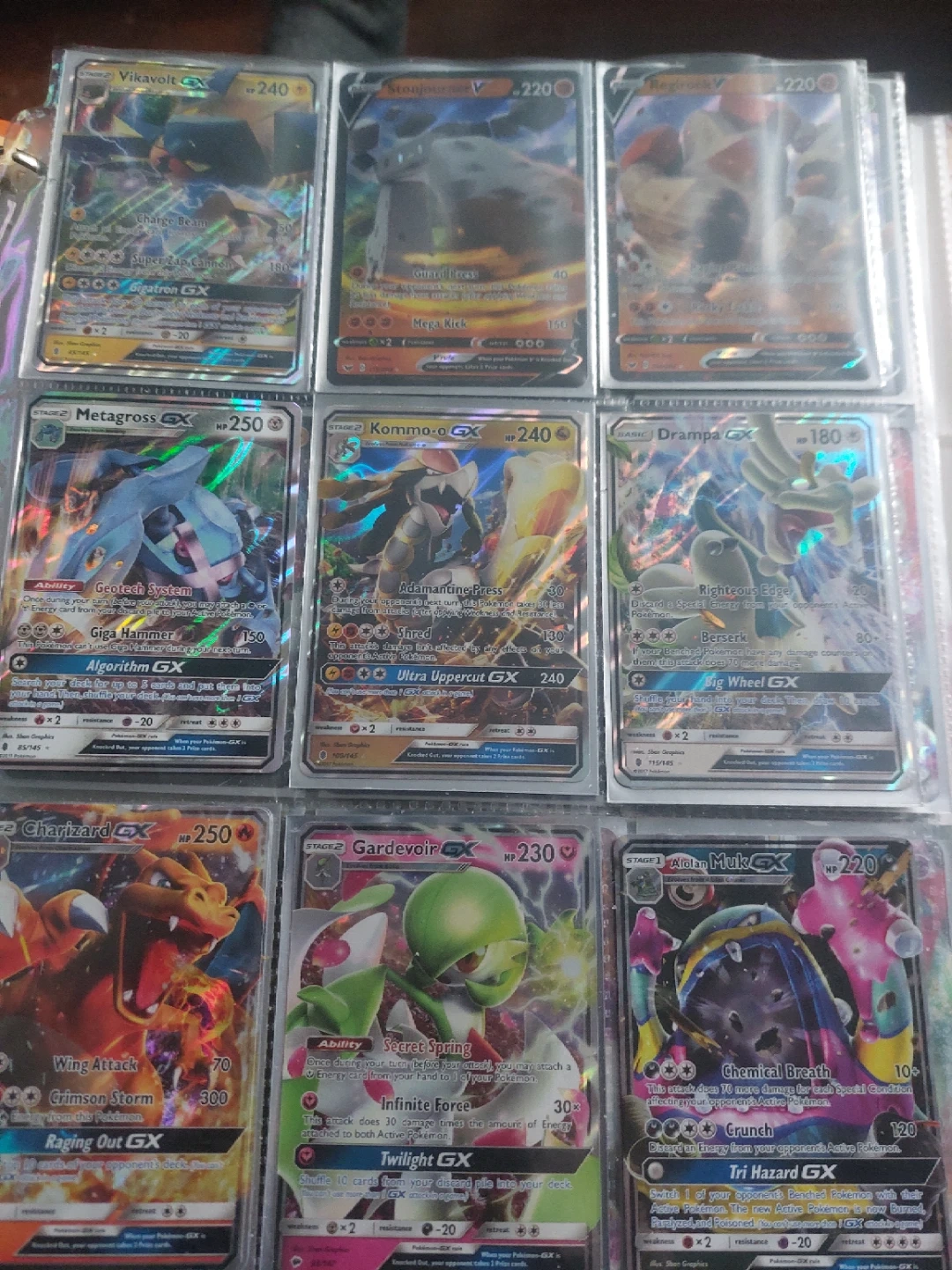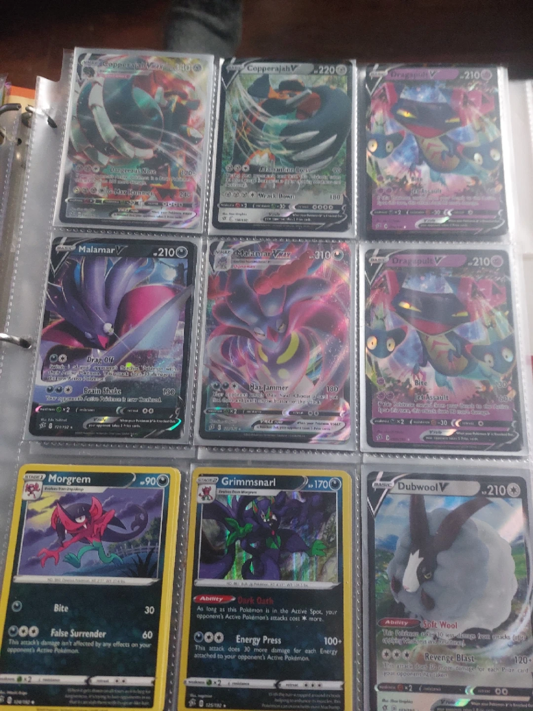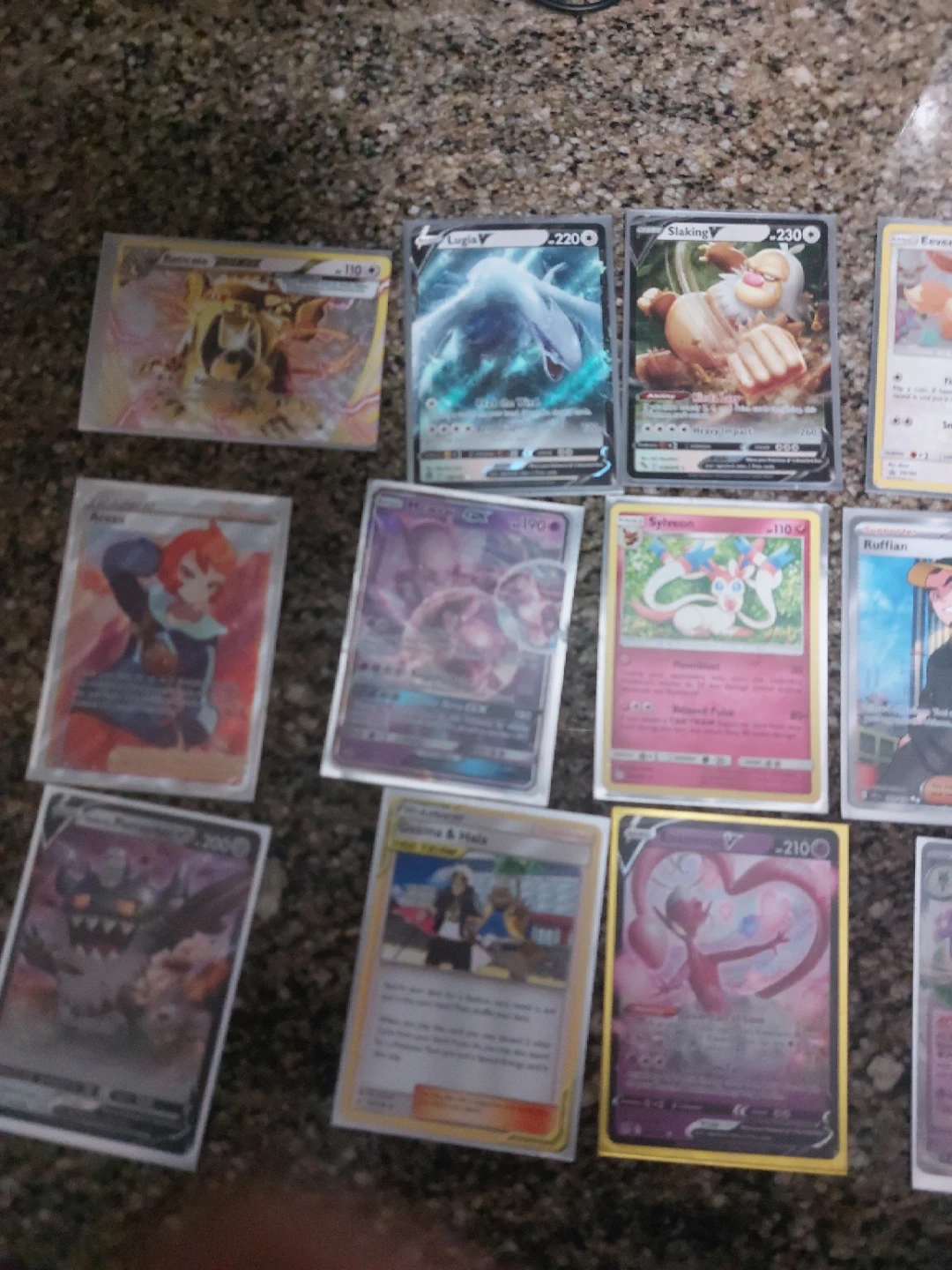 Collection of various Pokémon trading cards including V and EX cards. Includes characters like Giratina V, Mimikyu, Charizard, and more. Great for collectors!