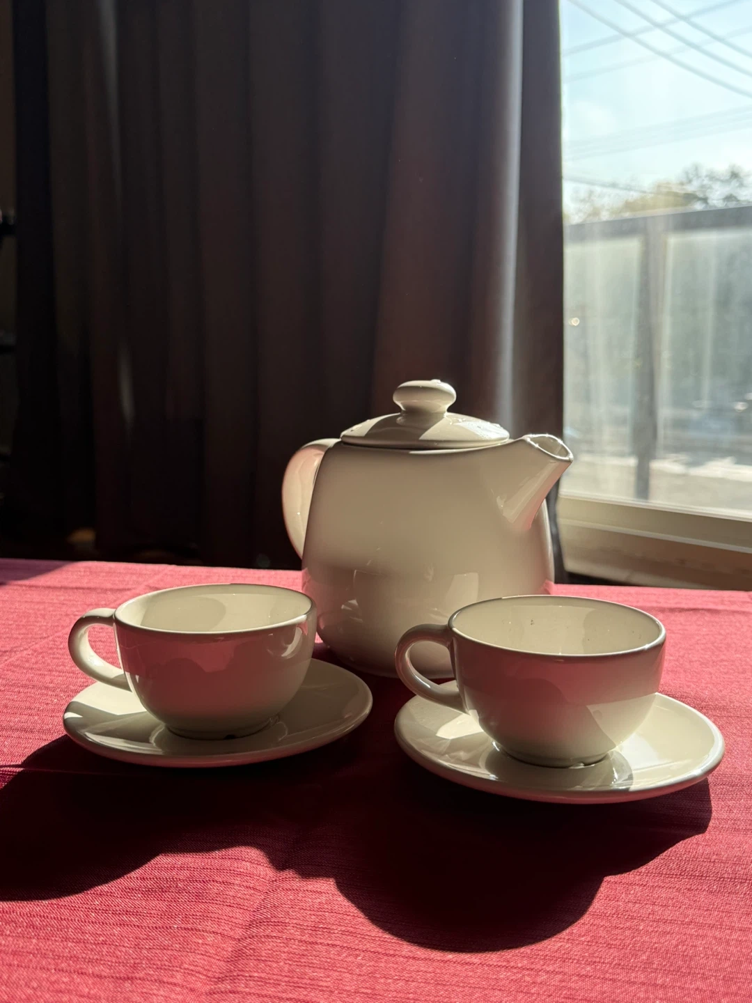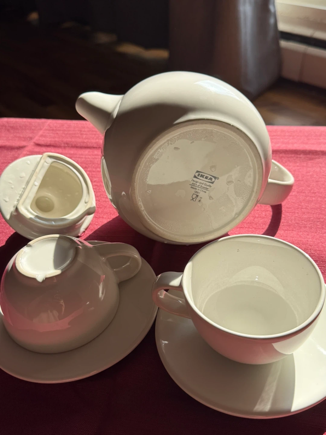 Selling a lovely cream-coloured teapot set from IKEA! It's in great condition and perfect for enjoying a nice cup of tea. Includes the teapot and two teacups with saucers. A charming addition to any kitchen or tea party