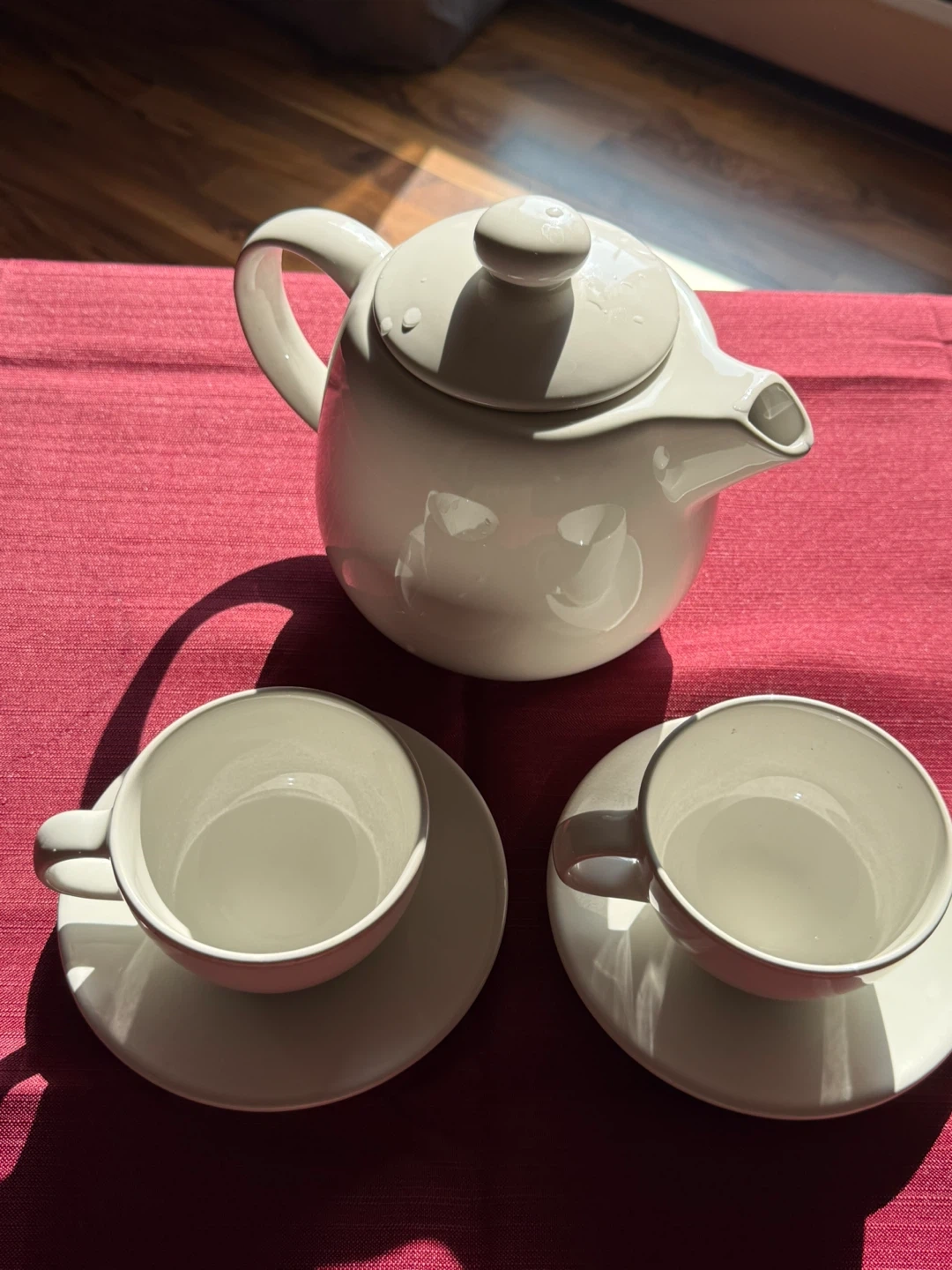 Selling a lovely cream-coloured teapot set from IKEA! It's in great condition and perfect for enjoying a nice cup of tea. Includes the teapot and two teacups with saucers. A charming addition to any kitchen or tea party