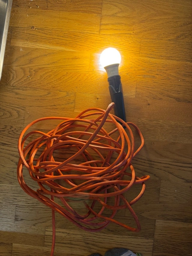 NOTE: Light NOT included. For test/photo only. This corded work light comes with approximately 25 feet of cord, making it ideal for various tasks around the house or in the workshop. It's in good working condition and ready to brighten up your projects!