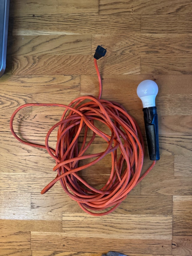NOTE: Light NOT included. For test/photo only. This corded work light comes with approximately 25 feet of cord, making it ideal for various tasks around the house or in the workshop. It's in good working condition and ready to brighten up your projects!