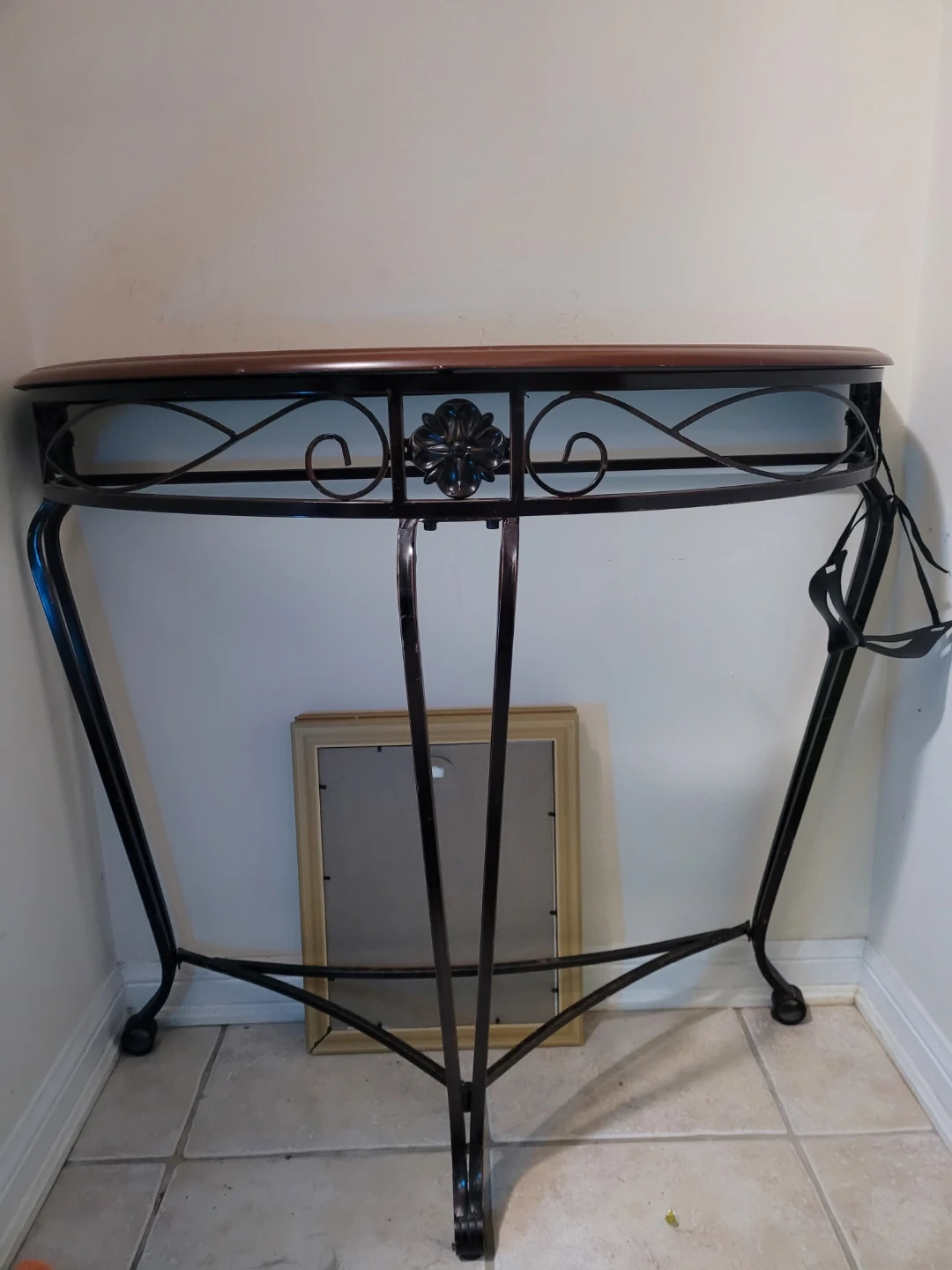 This console table features a rich wooden top with a curved edge, supported by an ornate black metal base. It's a stylish accent piece for your entryway or living room. Dimensions: 32"H x 37" W x 17" D.