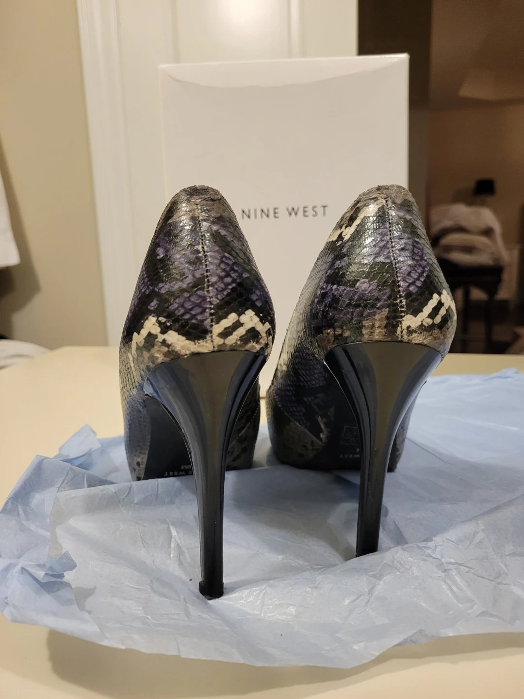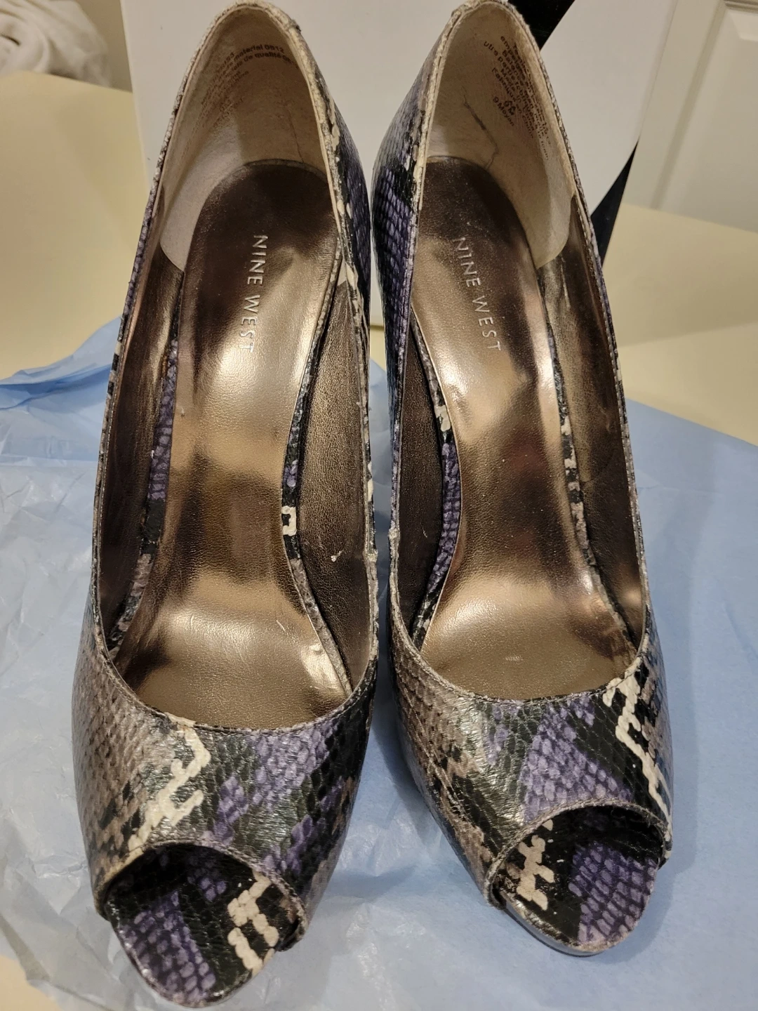 These Nine West peep-toe heels feature a snakeskin print in grey, black, and purple. Size is 9 medium. Original box included.