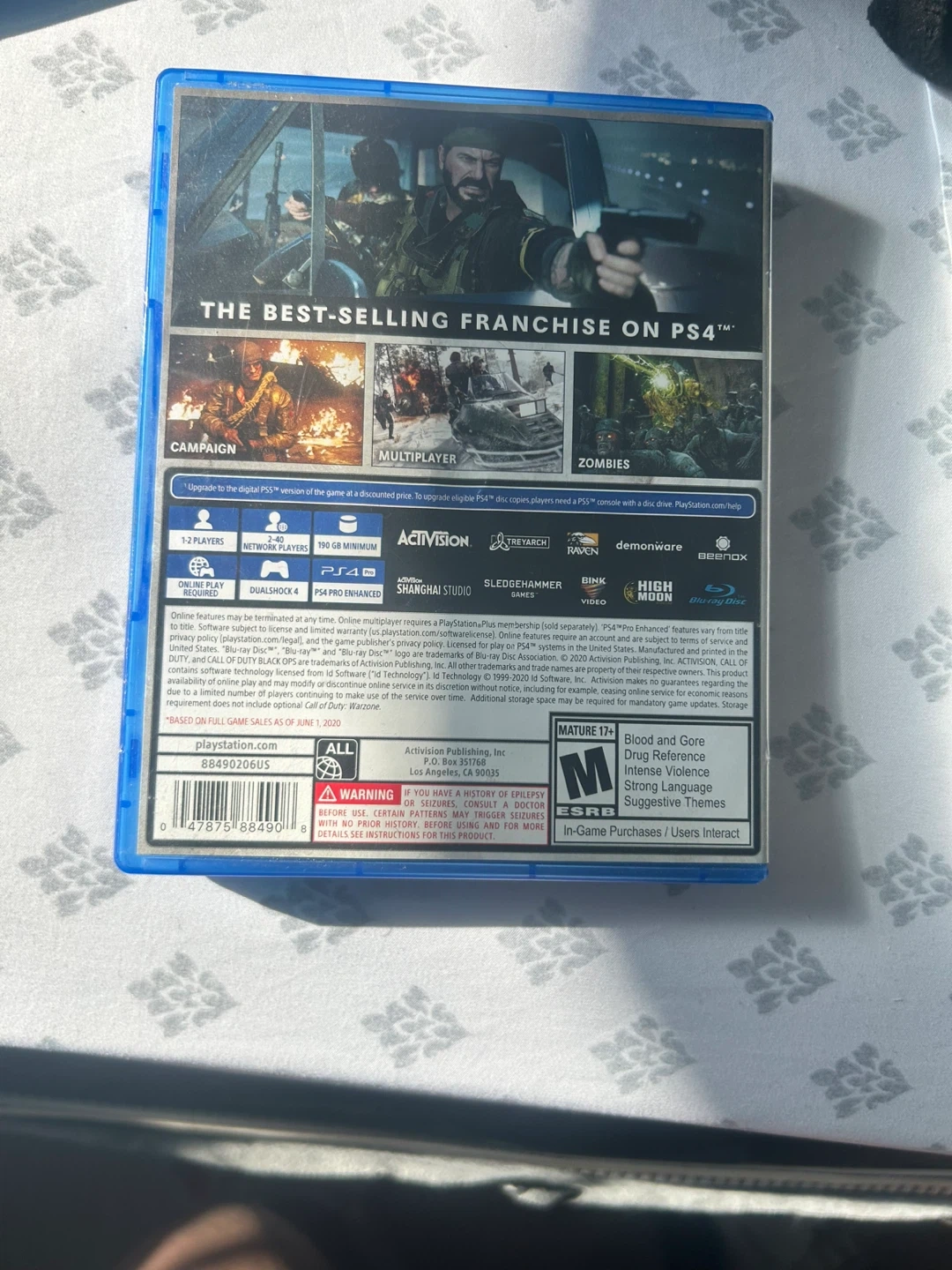 PlayStation 4 game disc for Call of Duty: Black Ops Cold War. Includes Campaign, Multiplayer, and Zombies modes. Requires internet connection for some features.