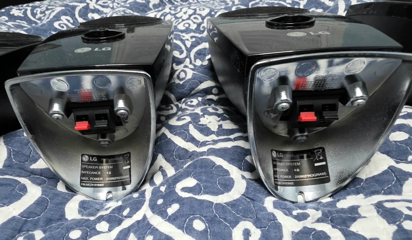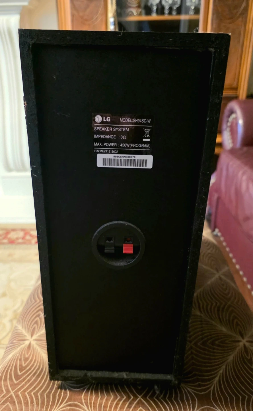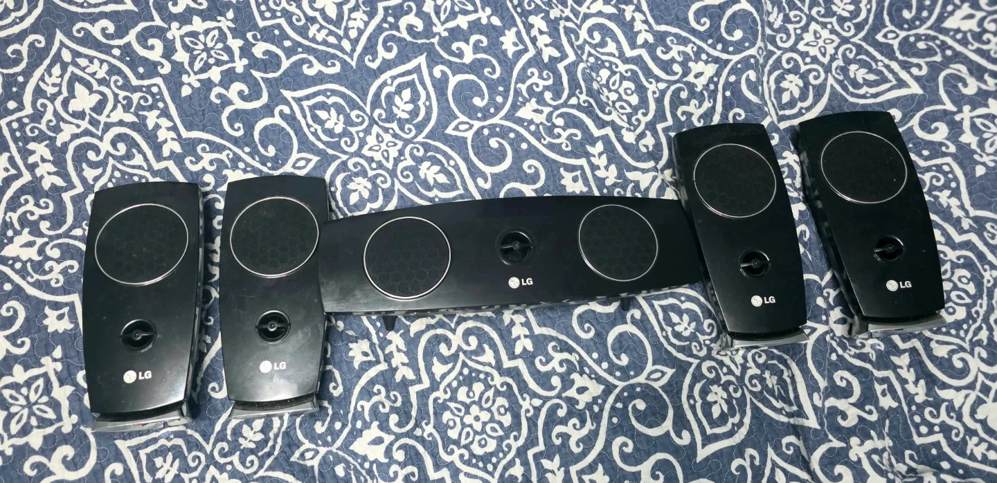 Complete LG speaker system. Has model SH94SC-C. This set includes 6 speakers. There are 4 upright speakers and 1 horizontal center speaker and a base bin. Max power is 310W and 4 Ohm impedance.