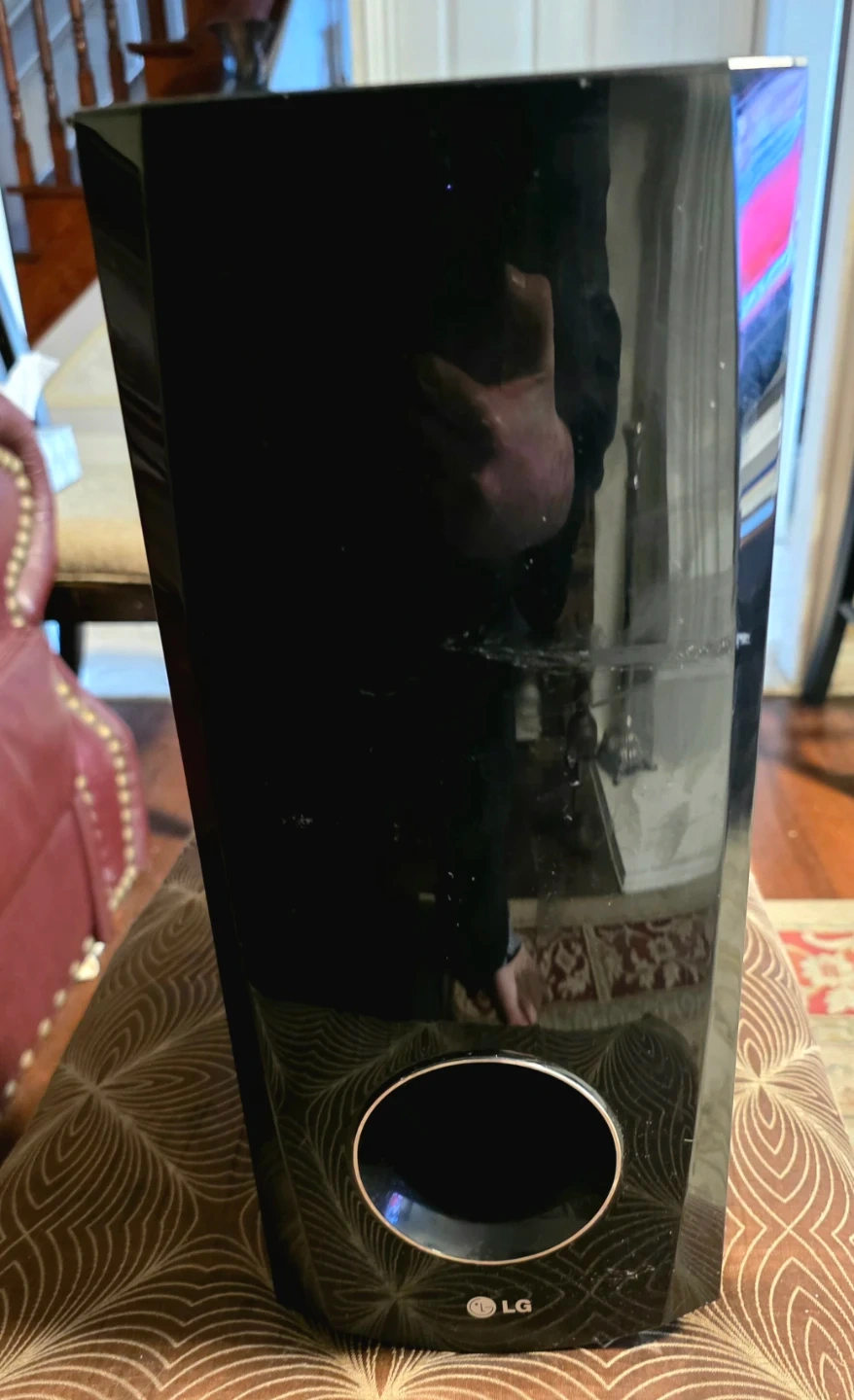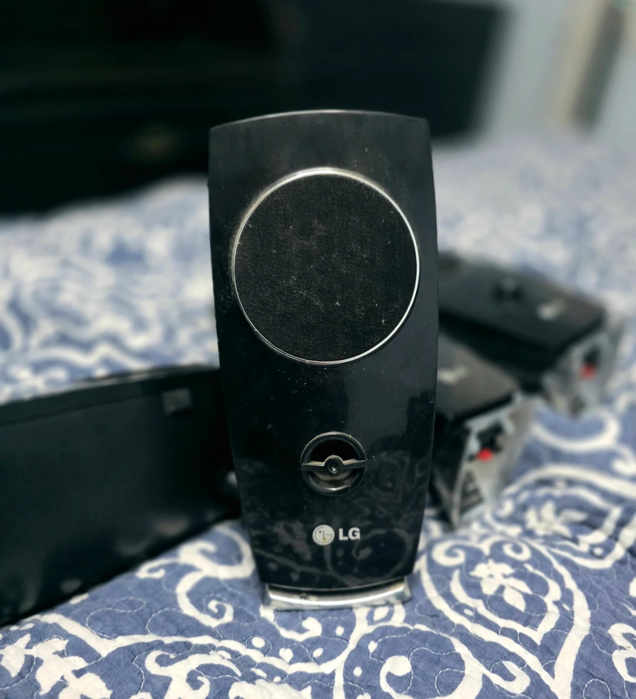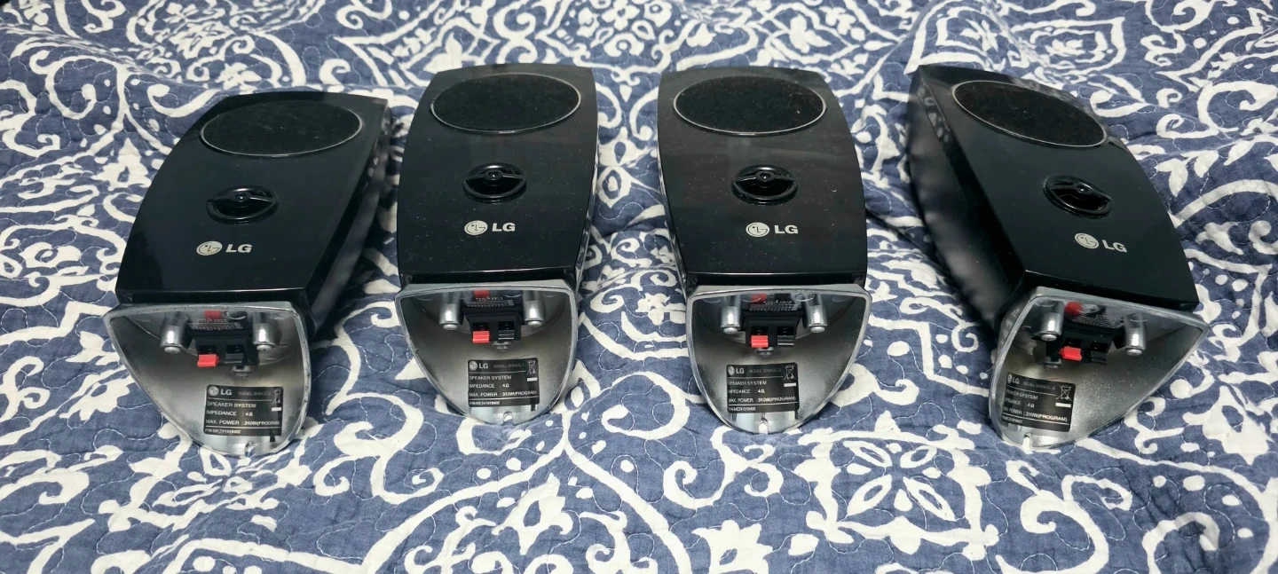 Complete LG speaker system. Has model SH94SC-C. This set includes 6 speakers. There are 4 upright speakers and 1 horizontal center speaker and a base bin. Max power is 310W and 4 Ohm impedance.