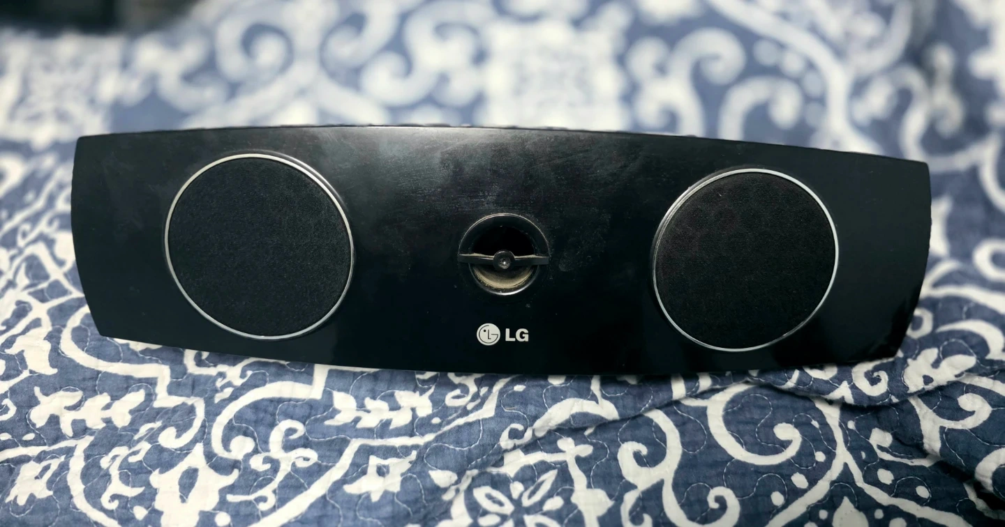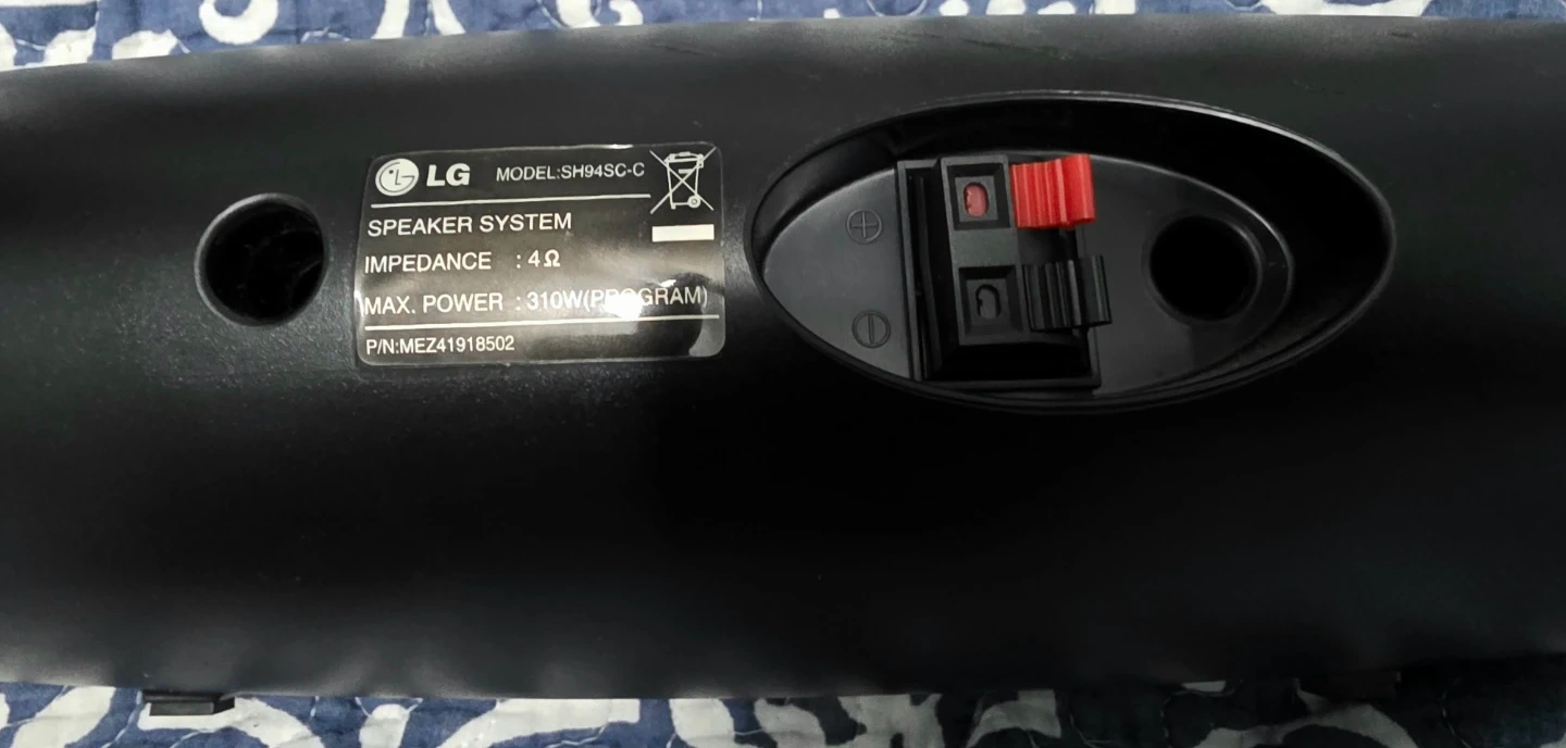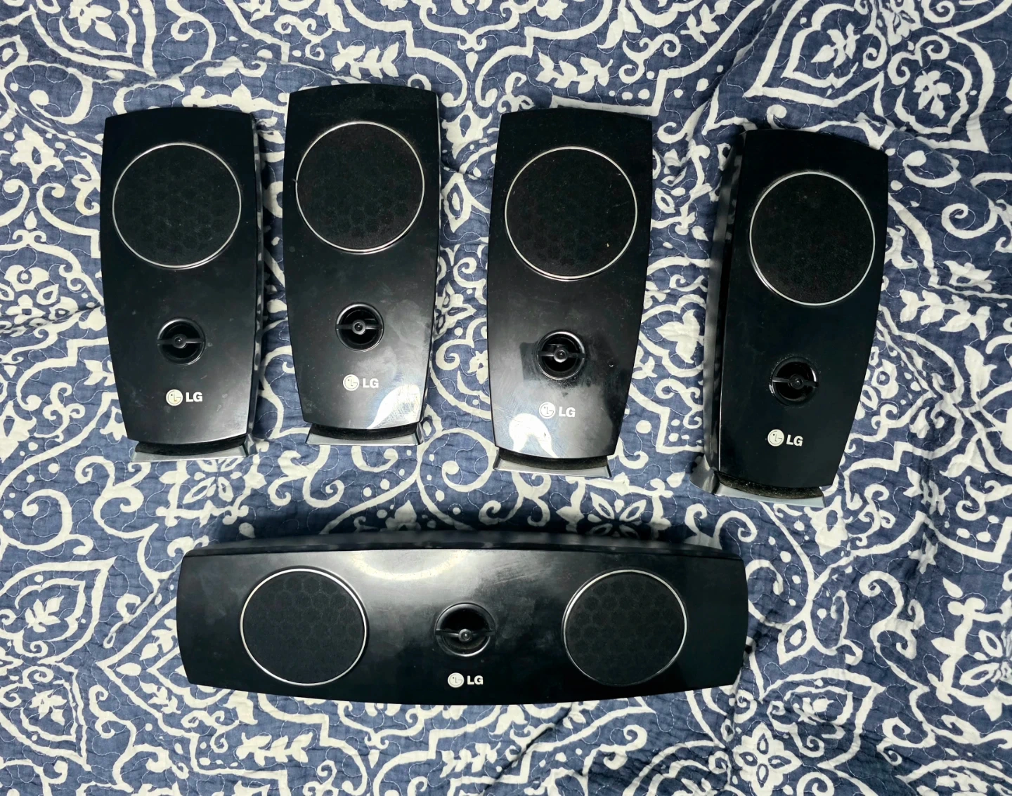 Complete LG speaker system. Has model SH94SC-C. This set includes 6 speakers. There are 4 upright speakers and 1 horizontal center speaker and a base bin. Max power is 310W and 4 Ohm impedance.