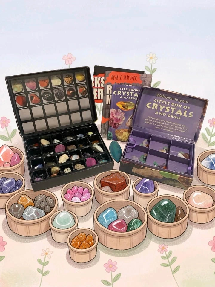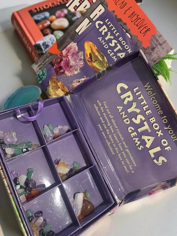 This beautiful set includes two amazing collections: a Little Box of Crystals and Gems with many small tumbled stones, perfect for collecting or gifting. It also includes a Read & Discover Crystals Set with labeled crystals like Amethyst, Tiger Eye, Sodalite, and more, plus some little books about crystals to learn and explore! Also included are some gorgeous little decorative rocks and a lovely rhinestone bracelet. This collection is only $35 CAD and is perfect for beginners, collectors, or anyone interested in the healing and beauty of crystals!
